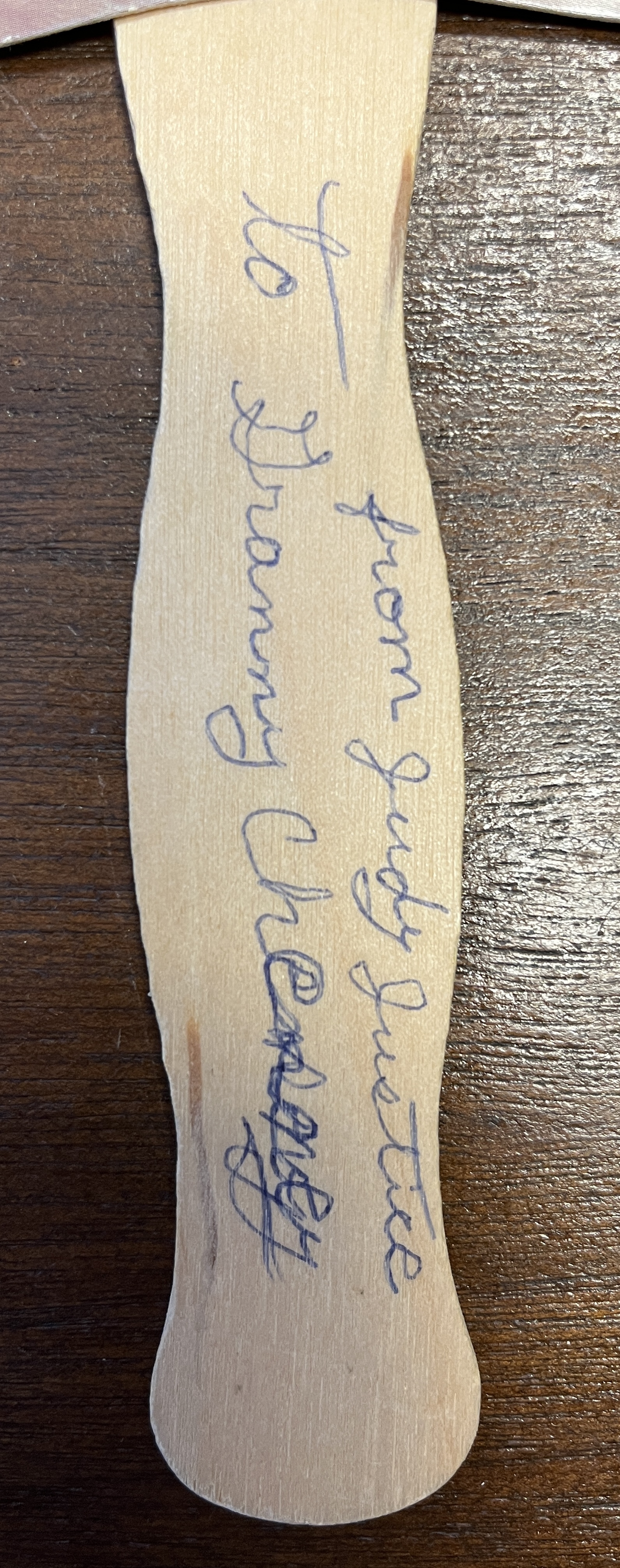 On the handle is says " to Granny Chesney from Judy Justice"