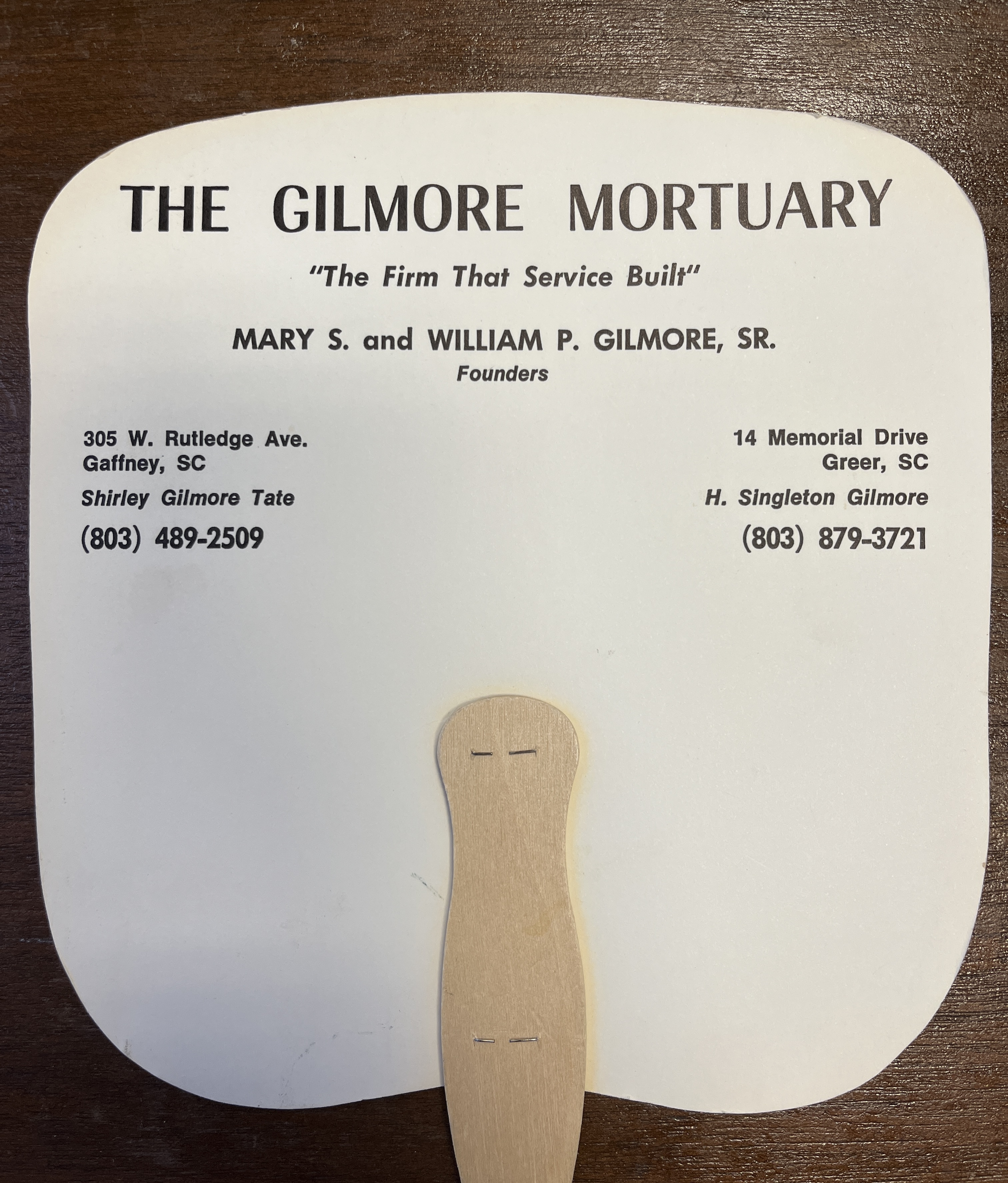 The back of the fan has the The Girlmore Mortuary with their logo "The Firm that Service Built" as well as their address, their phone number, and the Founders.