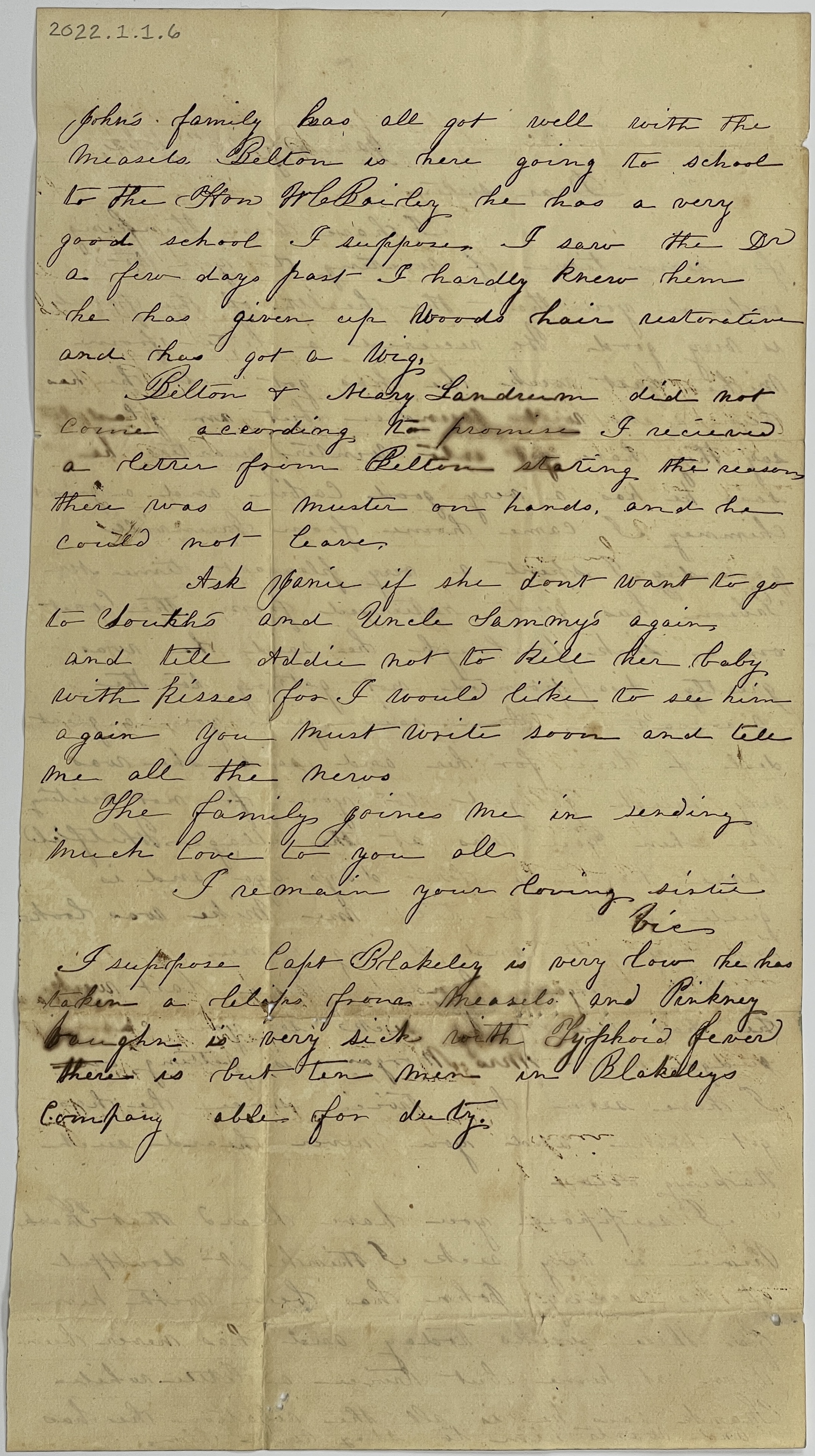 I suppose Capt Blakely is very low he has taken a [lelifs?] from measels and Pinkney Vaughn is very sick with Typhoid fever there is but ten men in Blakelys Company able for duty.