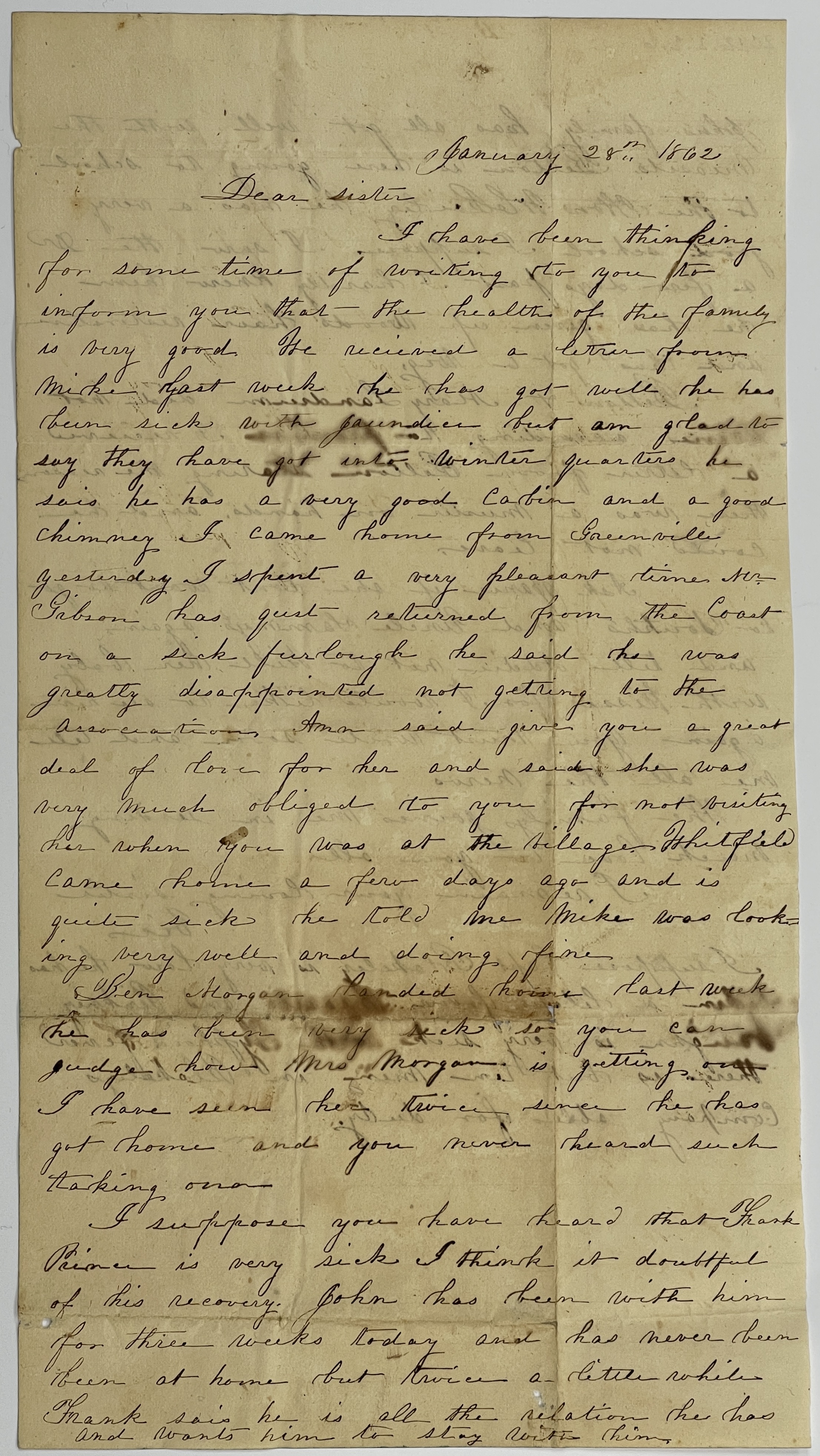 I have been thinking for some time of writing to you to inform you that the health of the family is very good. We received a letter from Mike last week he has got well he has been sick with jaundice but am glad to say they got into winter quarters he sais he has a very good cabin and a good chimney I came home from Greenville yesterday. I spent a very pleasant time. Mr. Gabson has just returned from the Coast on a sick furlough he said he was greatly disappointed not getting to the association. Ann said give you a great deal of love for her and said she was very much obliged to you for not visiting her when you was at the village. Whitfield came home a few days ago and is quite sick he told me Mike was looking very well and doing fine