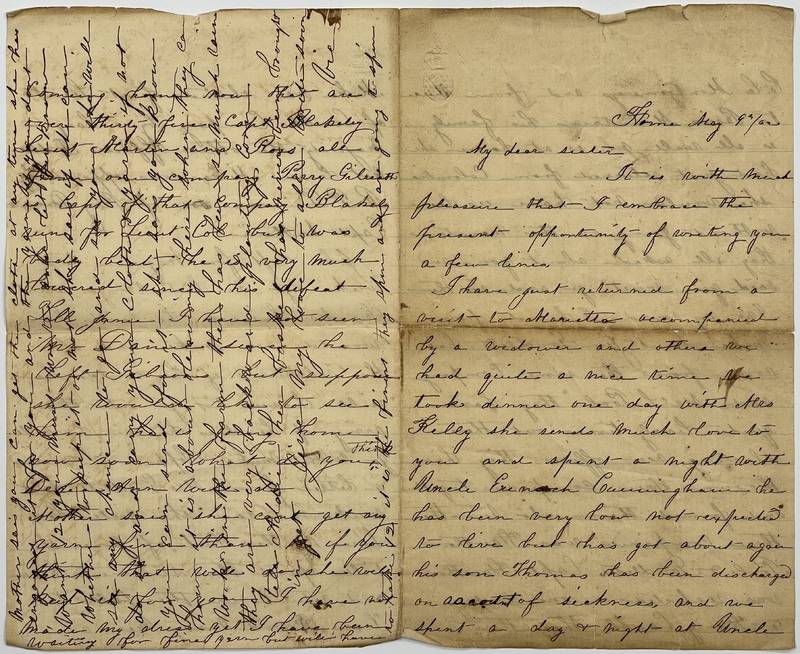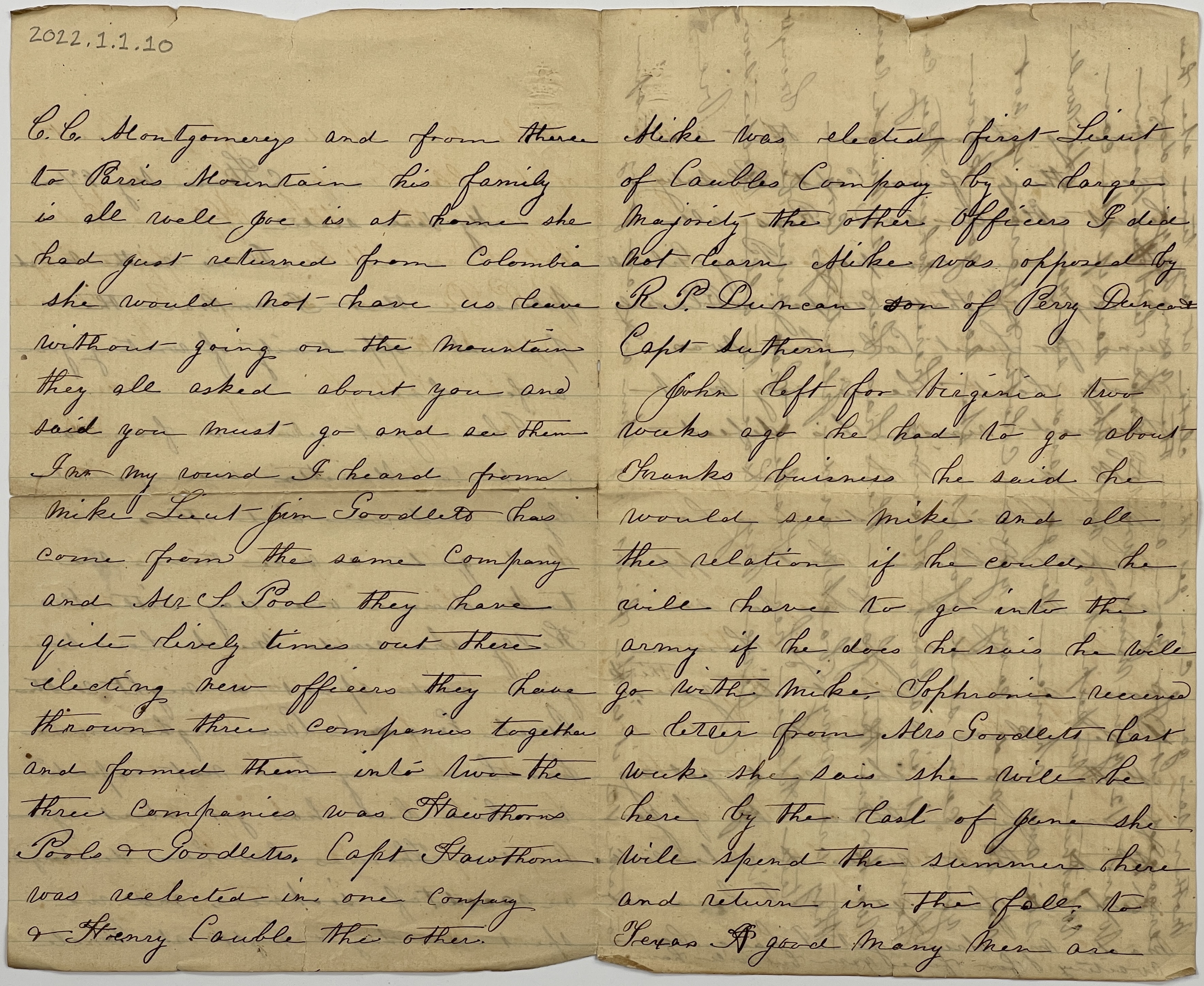 I have just returned from a visit to Marietta accompanied by a widower and others we had quite a nice time We took dinner one day with Mrs. Kelly she sends much love to you and spent a night with Uncle Eunoch Cunningham he has been very low not expected to live but has got about again his son Thomas has been discharged on account of sickness, and we spent a day & night at Uncle C.C. Montgomerey’s and from there to Parris Mountain his family is all well Joe is at home she had just returned from Columbia she would not have us leave without going on the mountain they all asked about you and said you must go and see them. I [no?] my round I heard from Mike Lieut Jim Goodlett has come from the same Company and Sir S. Pool they have quite lively times out there electing new officers they have thrown three companies together and formed them into two the three companies was Hawthorns Pools & Goodletts. Capt Hawthorn was reelected in one company and Henry Cauble the other. Mike was elected first Lieut of Caubles Company by a large majority the other officers I did not learn Mike was opposed by R P. Duncan son of Perry Duncan & Capt Suthern