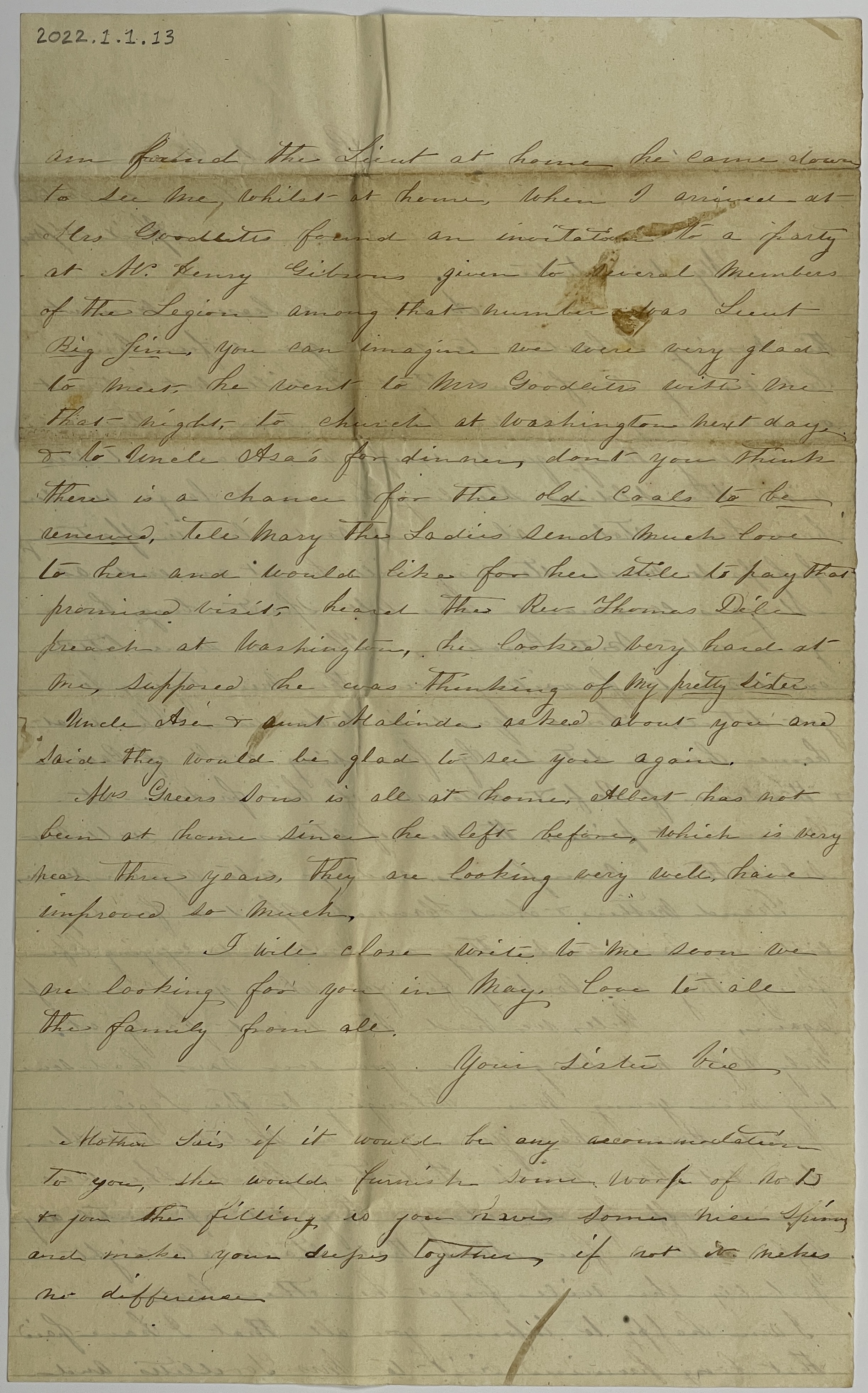 I am happy to inform you all that I have paid that long promised visit to Mrs Goodletts and am found the Lieut at home he came down to see me whilst at home, when I arrived at Mrs Goodletts found an invitation to a party at [Mr?] Henry Gibsons given to several members of the Legion among that number was Lieut Big Jim. you can imagine we were very glad to meet. He went to Mrs Goodletts with me that night, to church at Washington next day, & to Uncle Asa’s for dinner, dont you think there is a chance for the old coals to be renewed. Tell Mary the Ladies send much love to her and would like for her still to pay that promised visit. Heard the Rev Thomas Dile[?] preach at Washington. He looked very hard me. Supposed he was thinking of my pretty sister