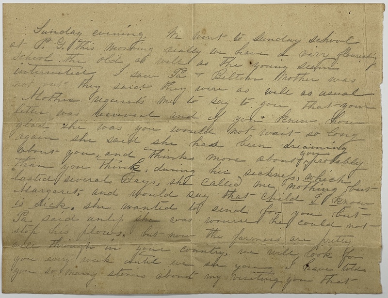 [….] Sunday evening. We went to Sunday School at P. G. [Pleasant Grove – ed.] this morning really we have a very flourishing school the old as well as the young seem interested I saw Pa & Belton Mother was not out they said they were as well as usual