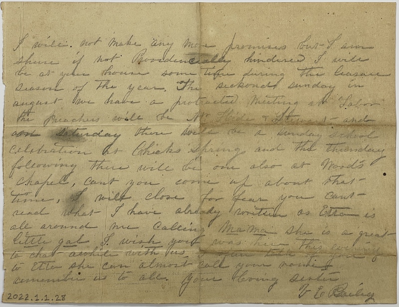 Mother requests me to say to you that your letter was received and if you knew how glad she was you would not wait so long again. She said she has been dreaming about you, and thinks more about you probably than you think, during her sickness, which lasted several days, she called me nothing but Margaret, and would say that child I know is sick. She wanted to send for you but Pa said unless she was wourse he could not stop his plows, but now the farmers are pretty well through in your country, we will look for you you every week until we see you — I have told you so many stories about my visiting you that I will not make any more promises but I am shure if not Providentially hindered I will be at your house some time during the leasure season of the year. The seckond sunday in august we have a protracted meeting at Tabor the Preachers will be Mr. [Fleide?] & Stewart and on saturday there will be a sunday school celebration at Chicks Spring and the Thursday following there will be one also at Wood’s Chapel, cant you come up about that time, I will close for fear you cant read read what I have already written as Etta is all around me calling Ma Ma she is a great little gal I wish you was here this evening to chat awhile with us I often tell of you to Etta she can almost call your name.