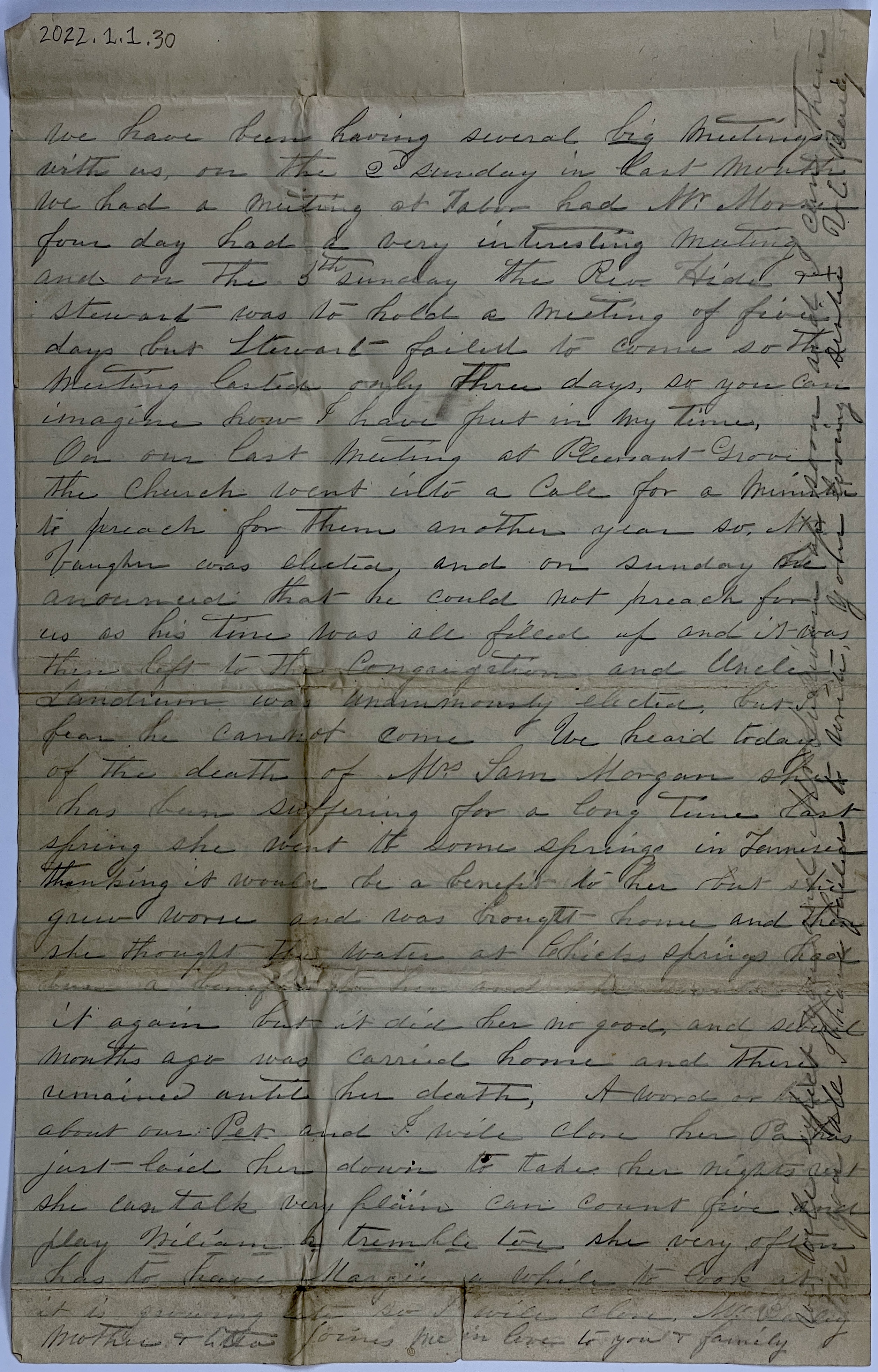 We heard today of the death of Mrs. Sam Morgan she has been suffering for a long time last spring she went to some Springs in Tennessee thinking it would be a benefit to her but she grew worse and was brought home and then she thought the water at Chicks Springs had been a benefit to her and she would try it again but it did her no good, and several months ago was carried home and there remained until her death,