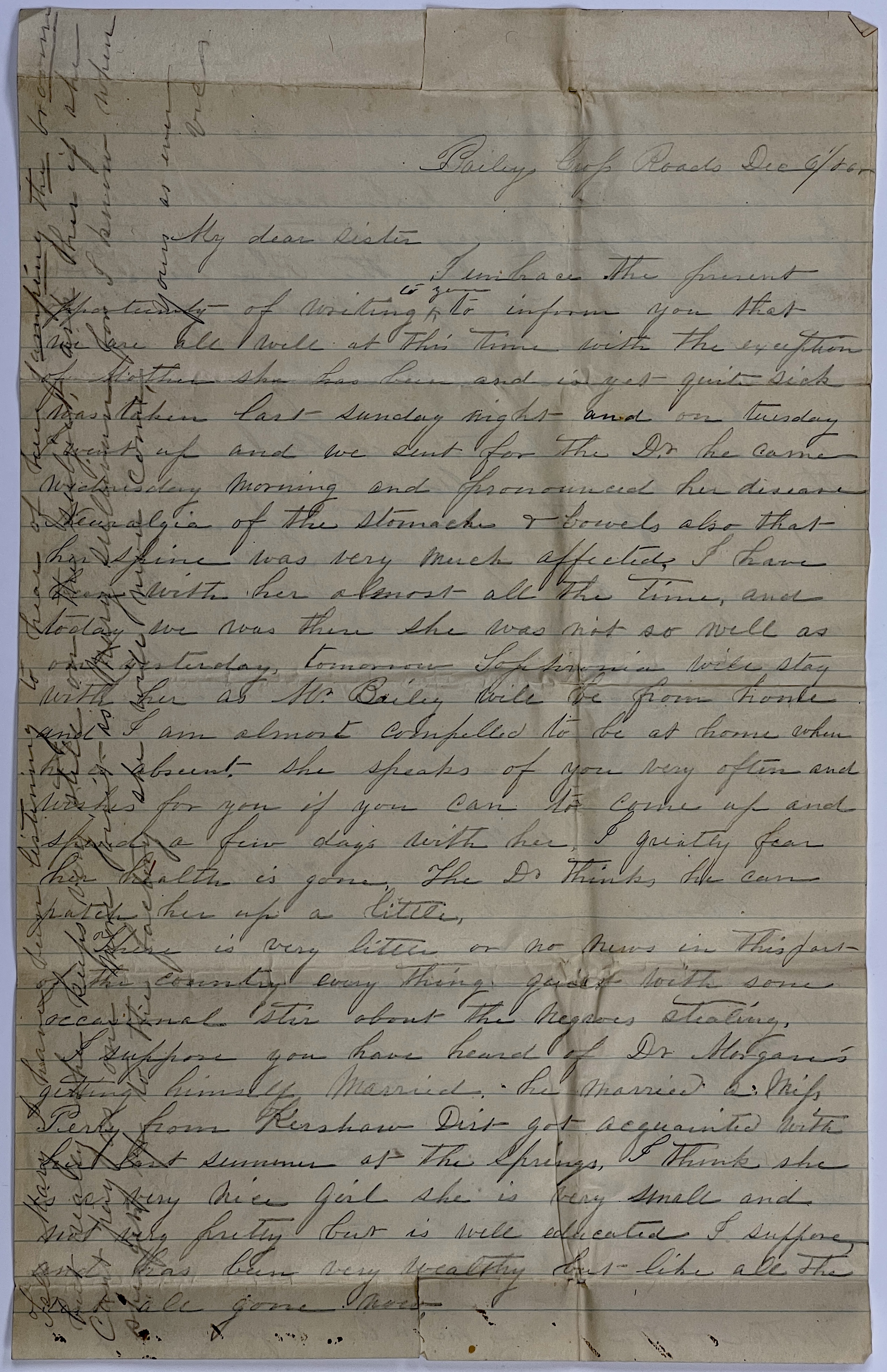 I embrace the present opportunity of writing to you to inform you that we are all well at this time with the exception of Mother she has been and is quite sick was taken last Sunday night and on tuesday I went up and we sent for the Dr. he came Wednesday morning and pronounced her disease Neuralgia of the Stomach & bowels also that her spine was very much affected, I have been with her almost all the time, and today we was there she was not so well as on yesterday. tomorrow Sophronia will stay with her as Mr. Bailey will be from home and I am almost compelled to be at home when he is absent. she speaks of you very often and wishes for you if you can to come up and spend a few days with her, I greatly fear her health is gone, the Dr. thinks he can patch her up a little.