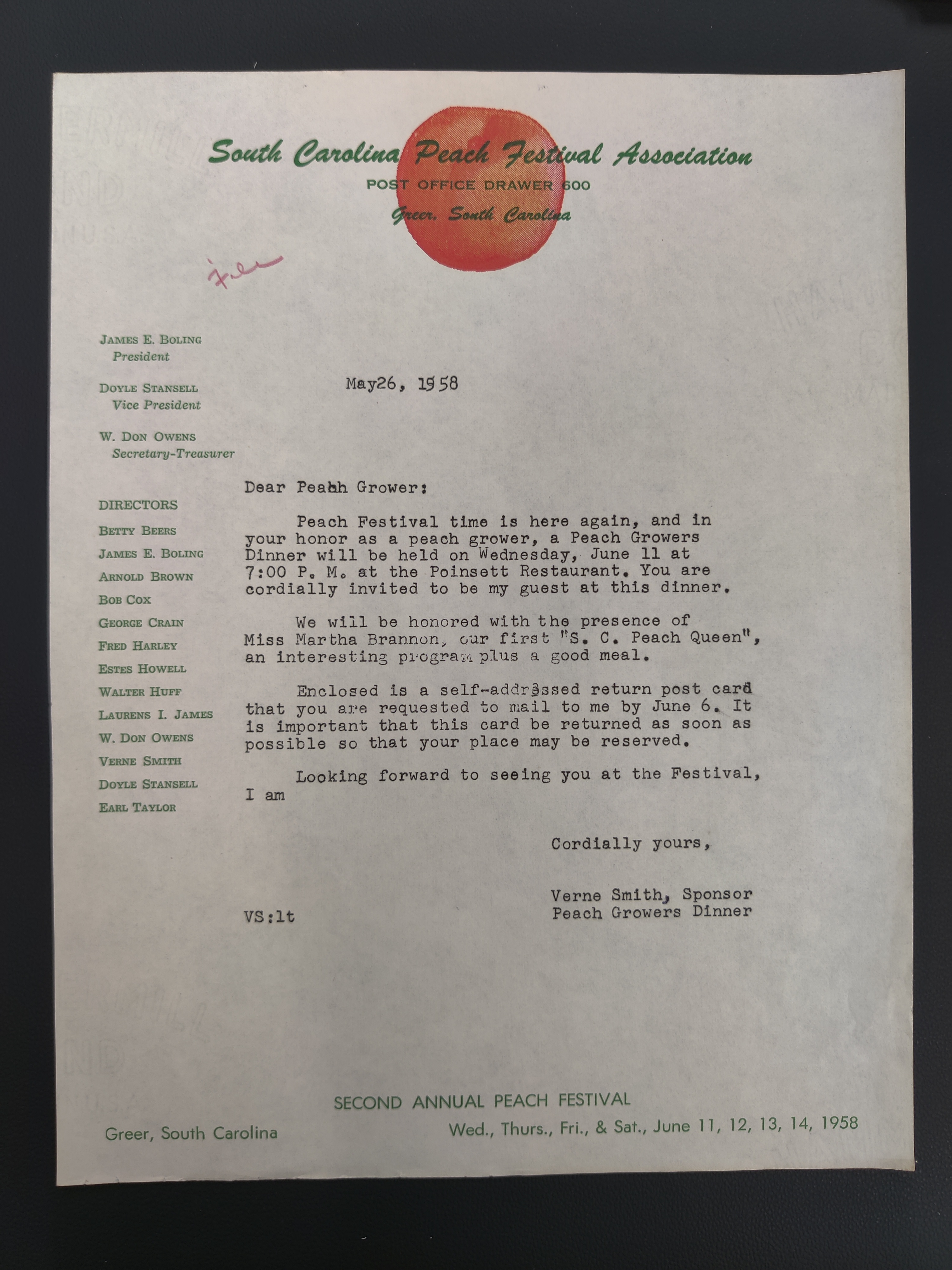 Letter: 1958 Peach Festival dinner invitation to peach growers