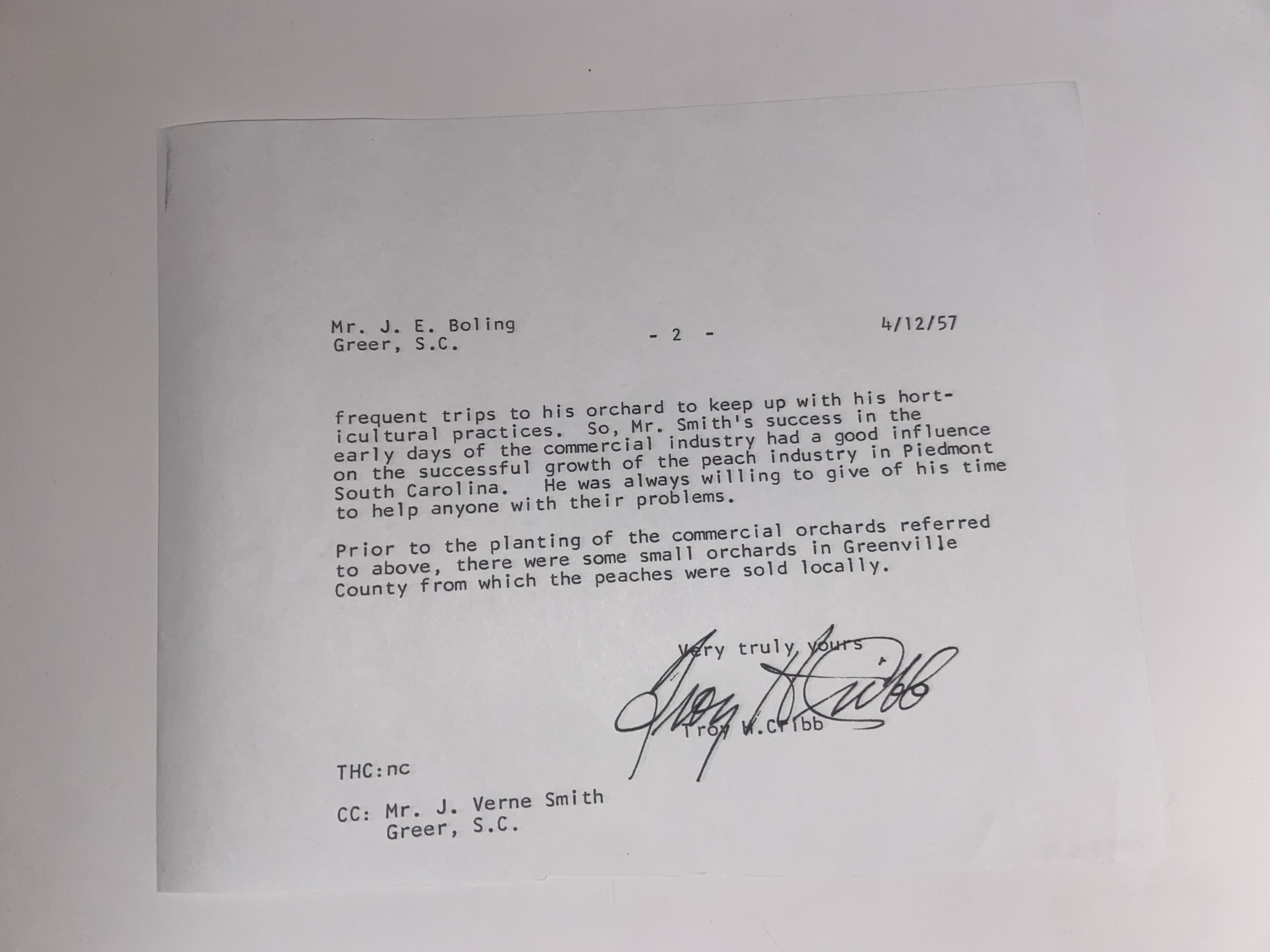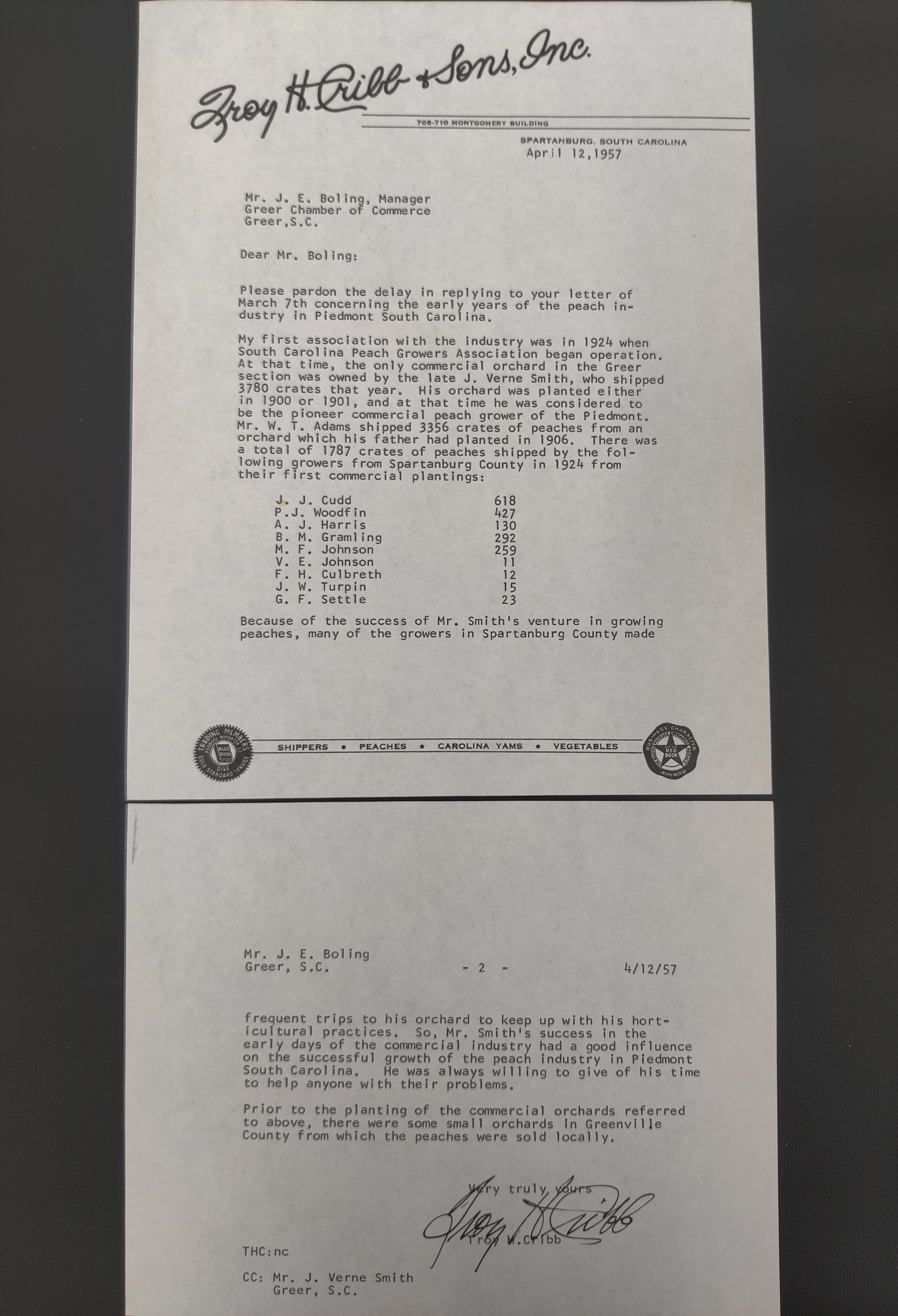 Letter from Troy Cribbs to J. E. Boling of the Greer Chamber of Commerce explaining the history of the peach industry in the Piedmont region of South Carolina (2 sheets)