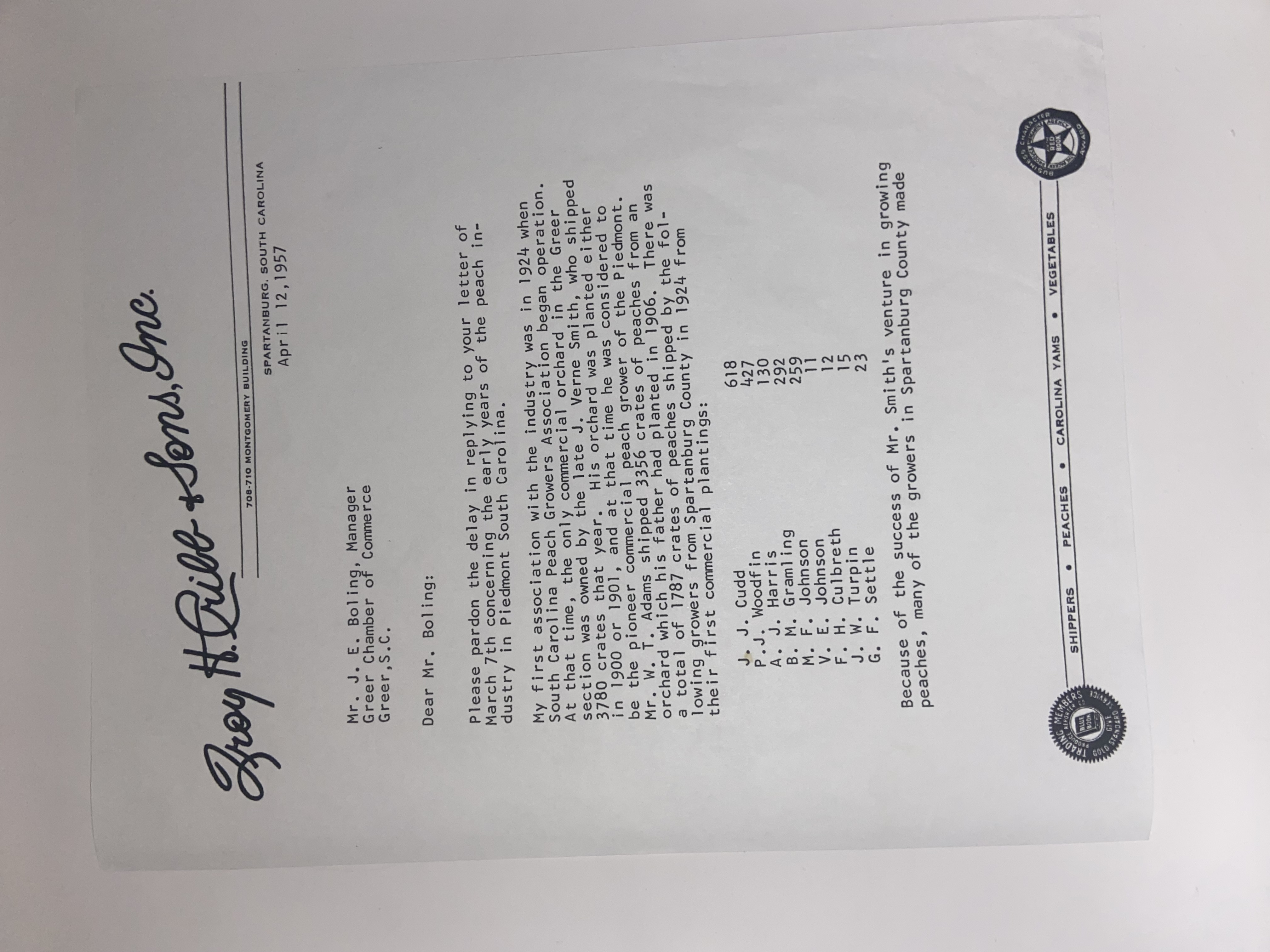 Please pardon the delay in replying to your letter of March 7th concerning the early years of the peach industry in Piedmont South Carolina.