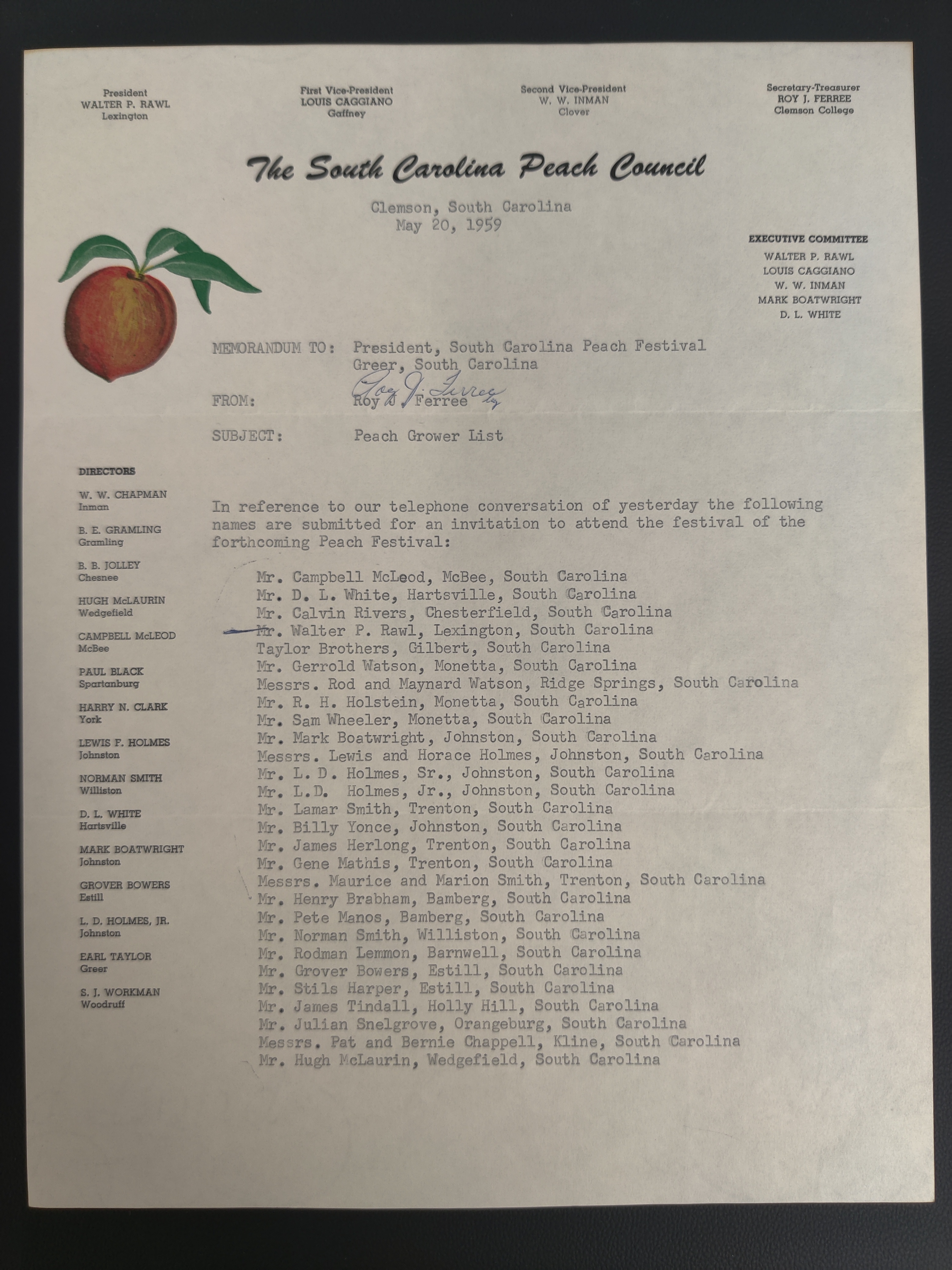 An invitation list for the 1959 Peach Festival submitted by Roy J. Ferree