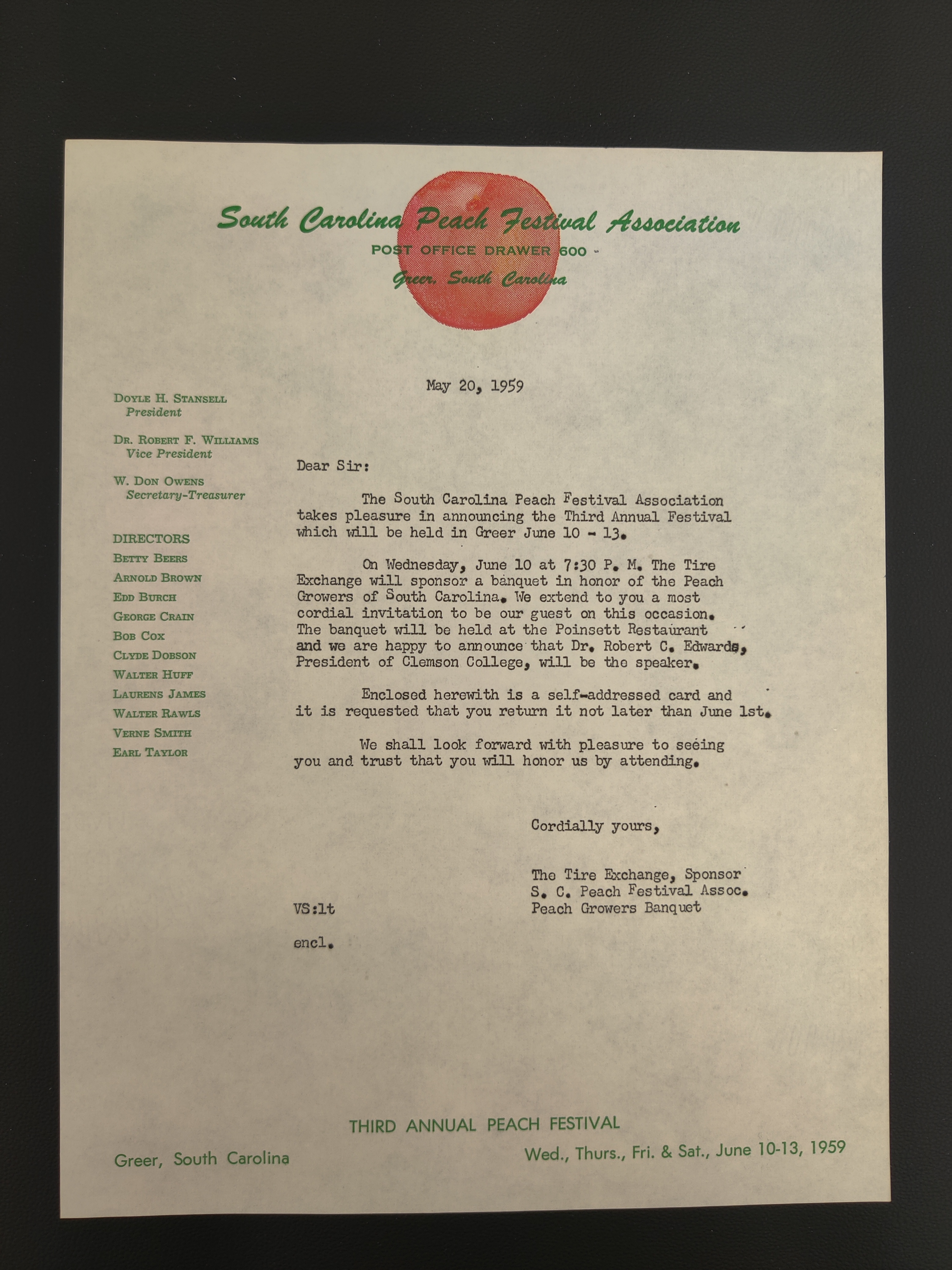 On Wednesday, June 10 an 7:30 P. M. The Tire Exchange will sponsor a banquet in honor of the Peach Growers of South Carolina. We extend to you a most cordial invitation to be our guest on this occasion. The banquet will be held at the Poinsett Restaurant and we are happy to announce that Dr. Robert C. Edwards, President of Clemson College, will be the speaker.