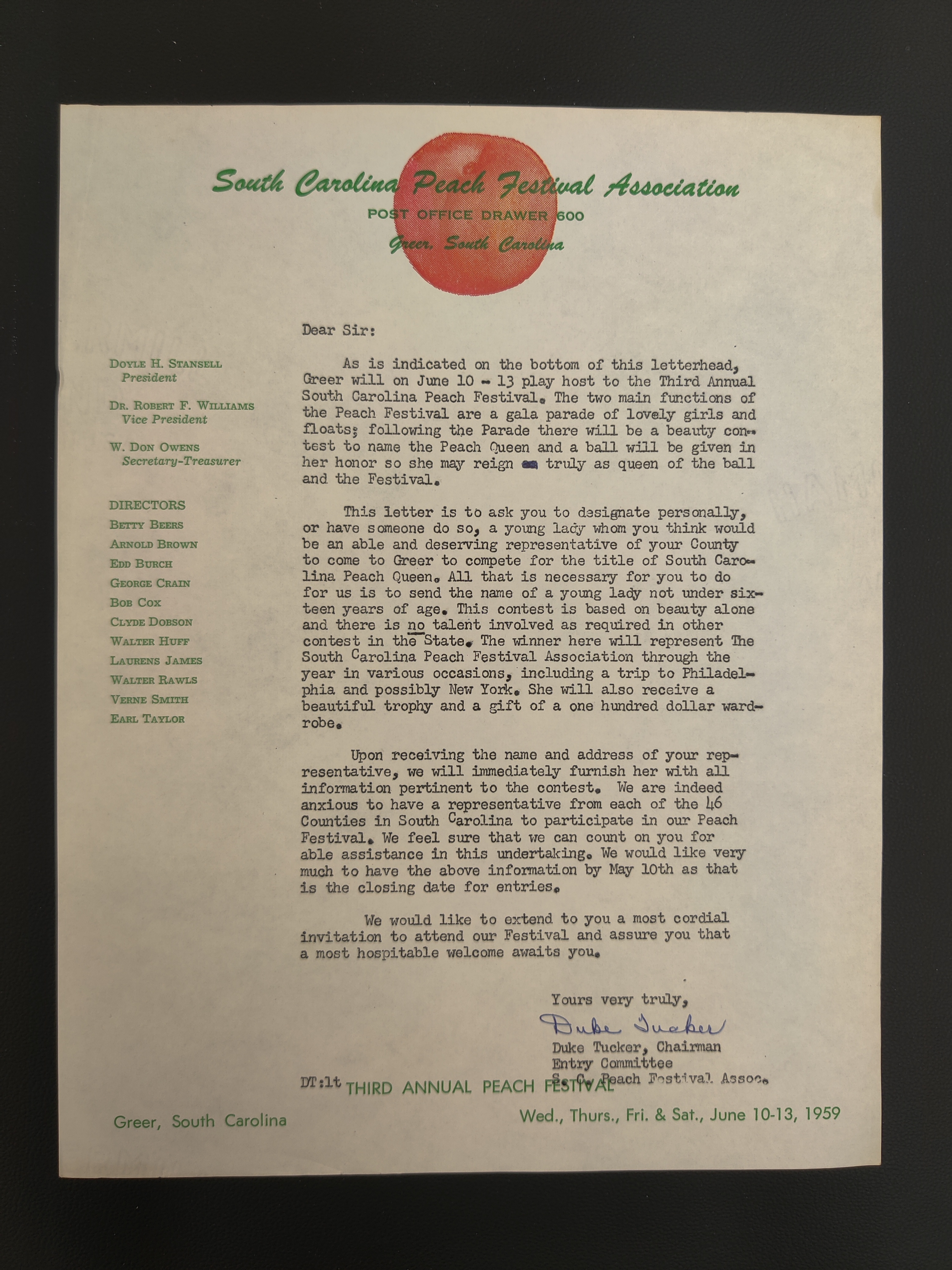 - Letter from Duke Tucker requesting entries for beauty pageant participants for the 1959 Peach Festival