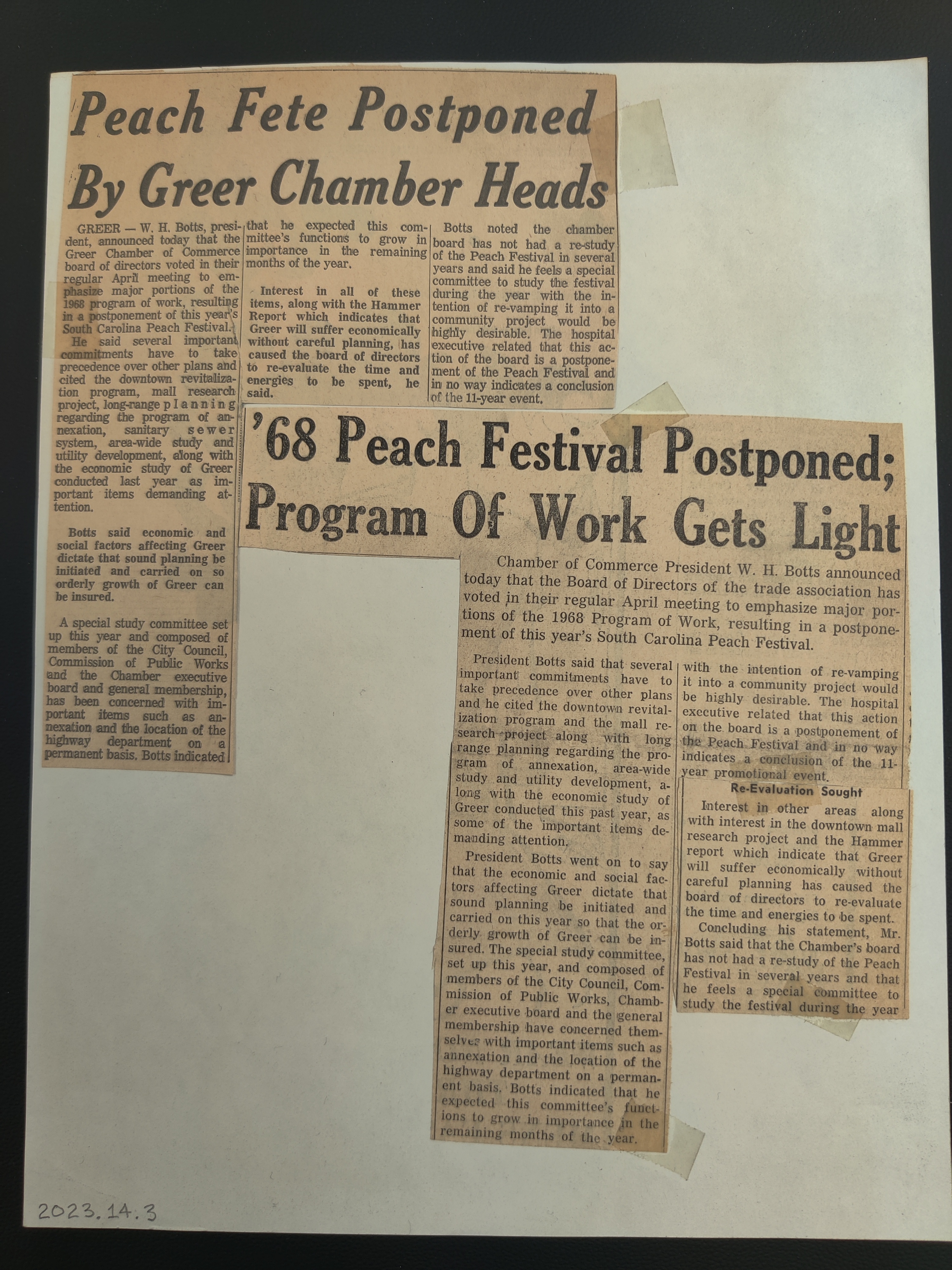 GREER -- W. H. Botts, president, announced today that the Greer Chamber of Commerce board of directors voted in their regular April meeting to emphasize major portions of the 1968 program of work, resulting in a postponement of this year's South Carolina Peach Festival.