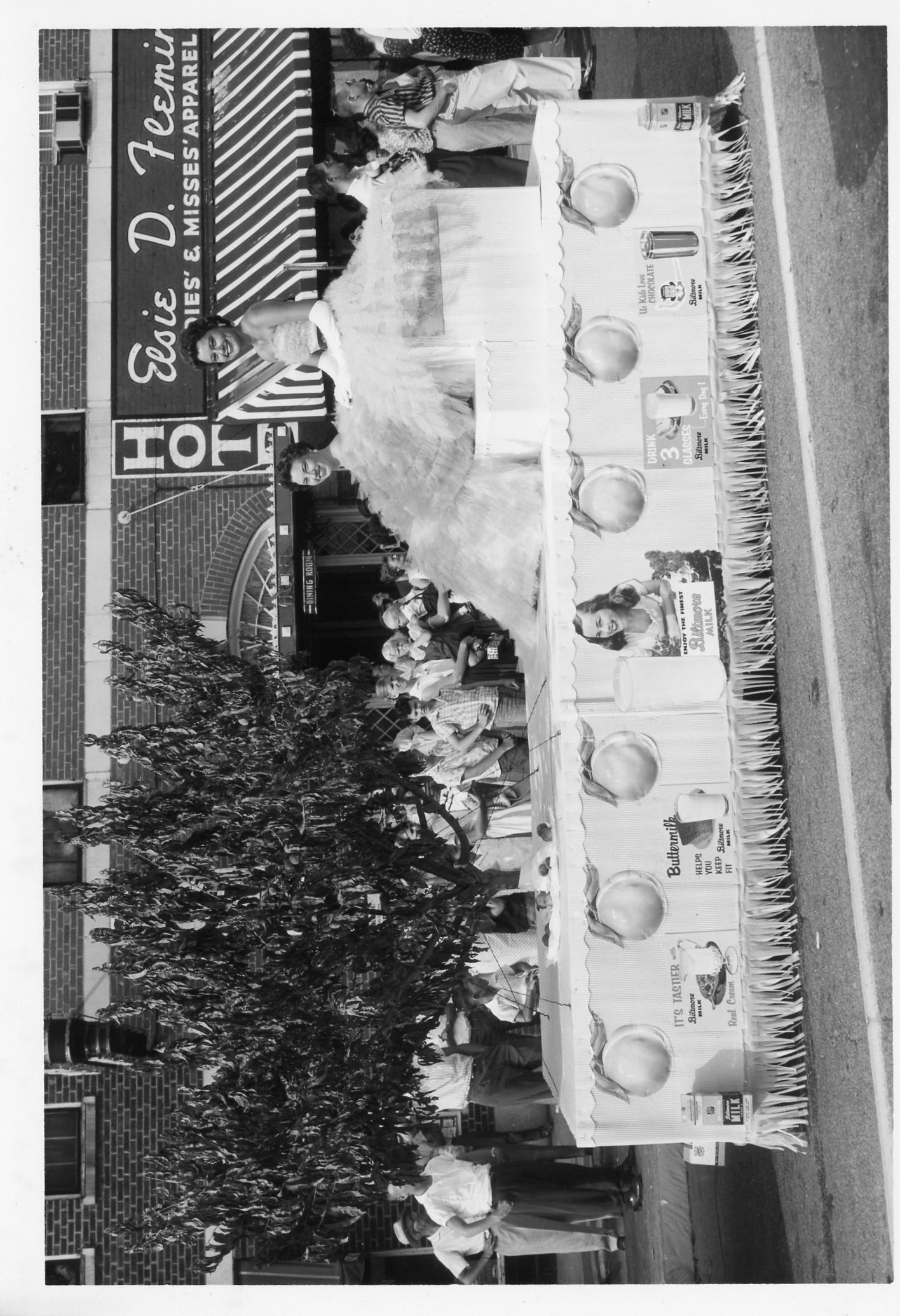 Photograph: Float in the 1958 Peach Festival Parade with '57 Peach Queen Martha Brannon
