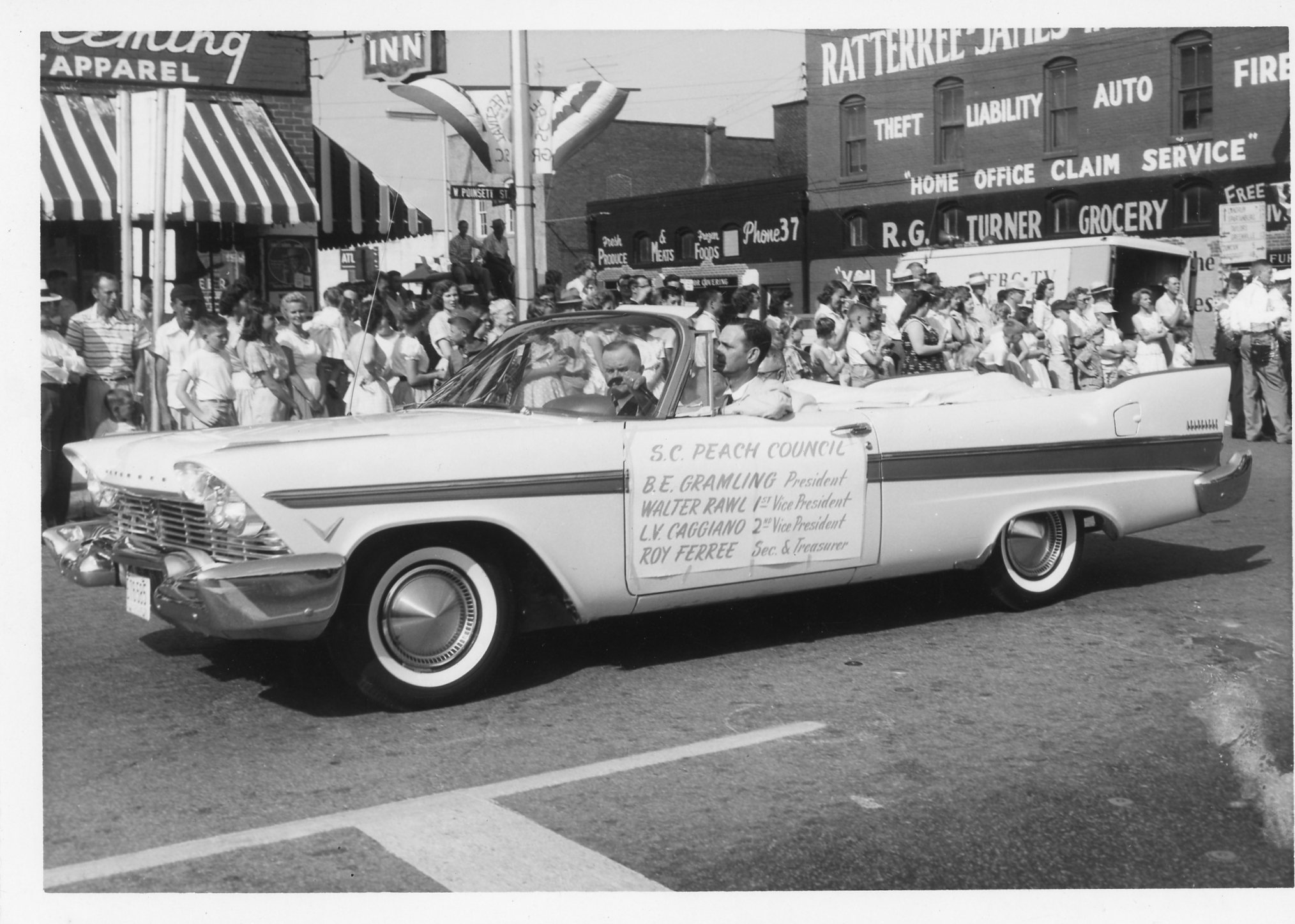 - S. C. Peach Council parade car, including B. E. Gramling (President), Walter Rawl (1st Vice President), L. V. Caggiano (2nd Vice President), Roy Ferree (Secretary and Treasurer). Photographed by Joe F. Jordan.