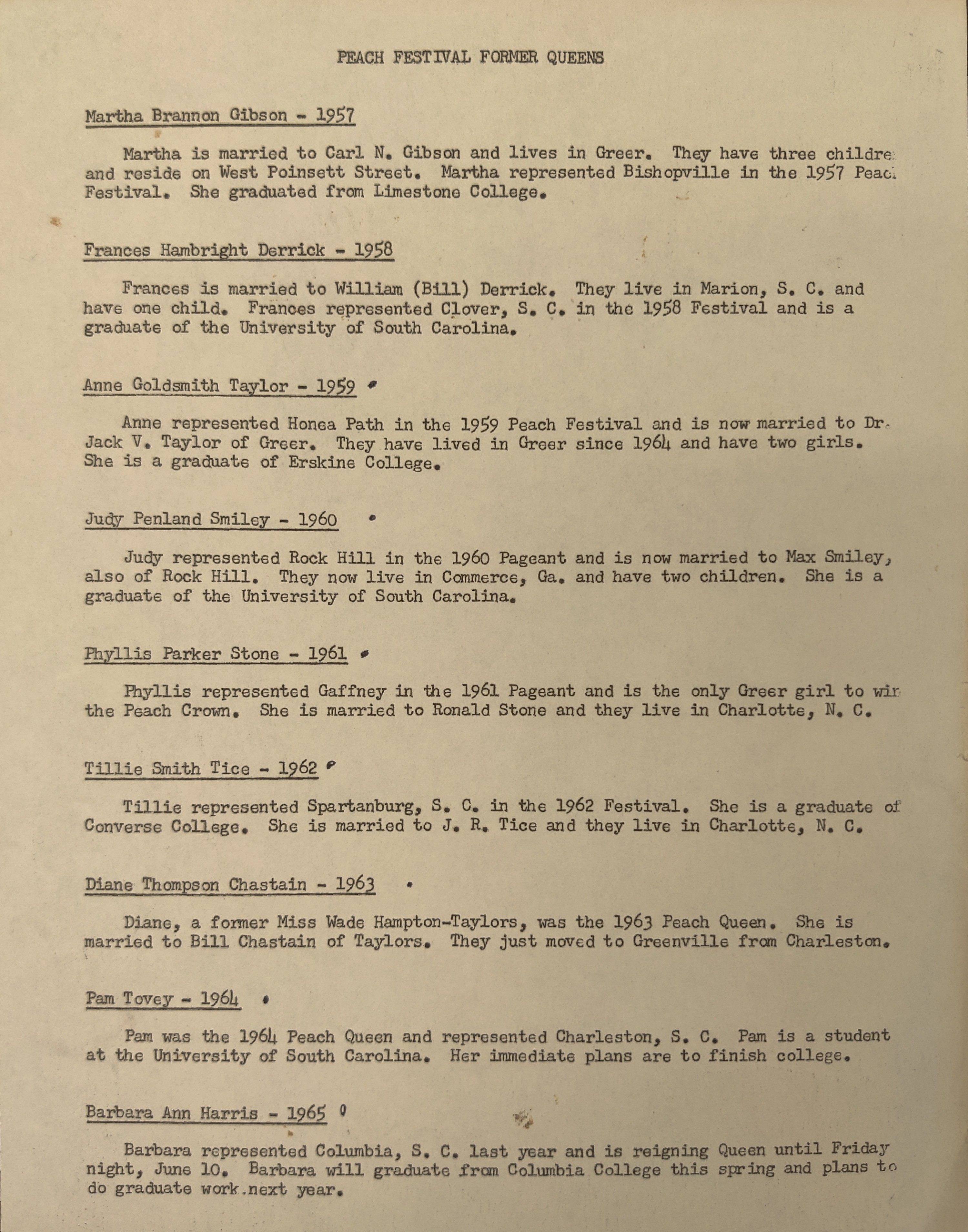 Phyllis represented Gaffney in the 1961 Pageant and is the only Greer girl to win the Peach Crown. She is married to Ronald Stone and they live in Charlotte, N. C.