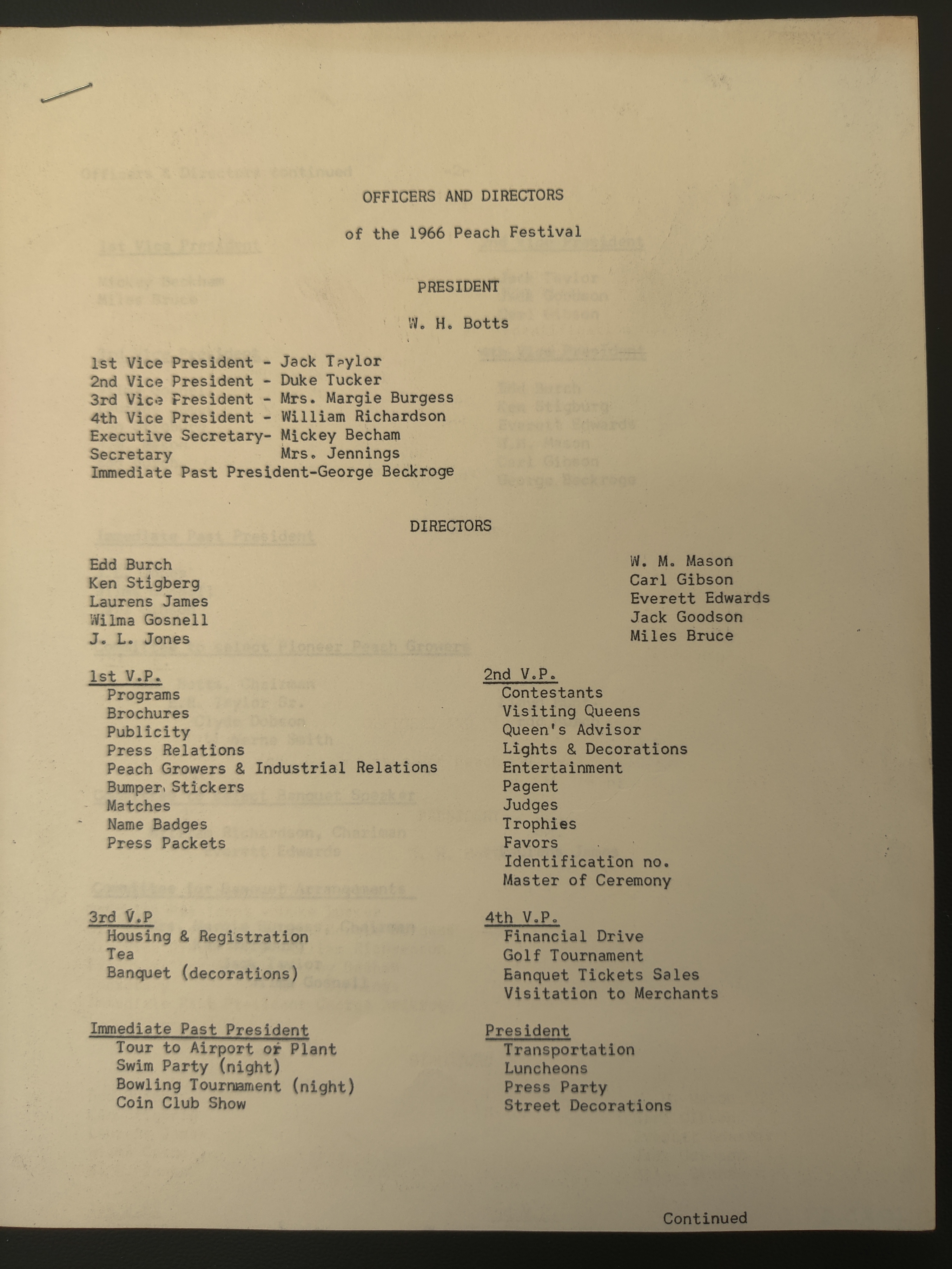 - A list of the officials of the 1966 Peach Festival and their respective responsibilites