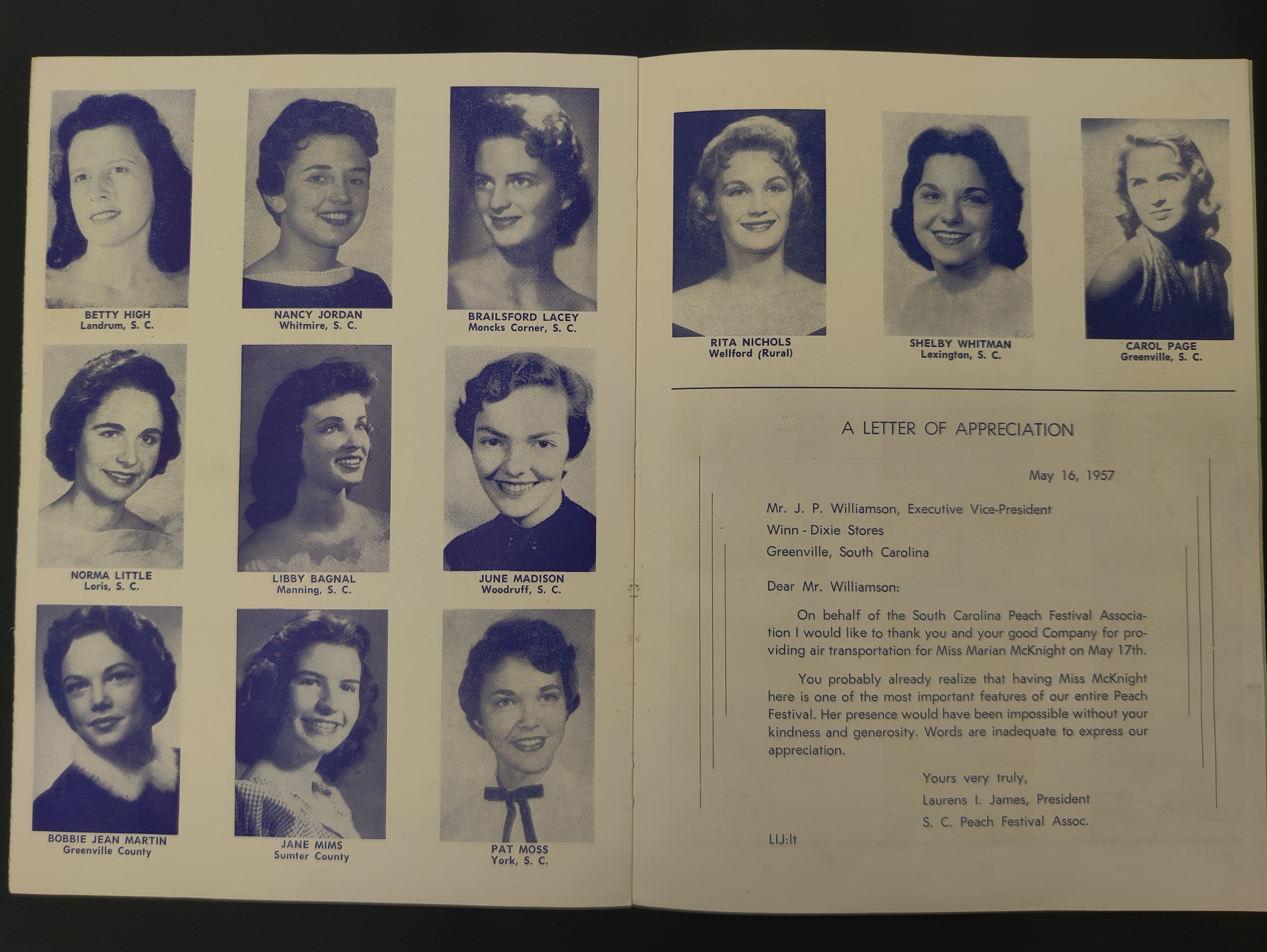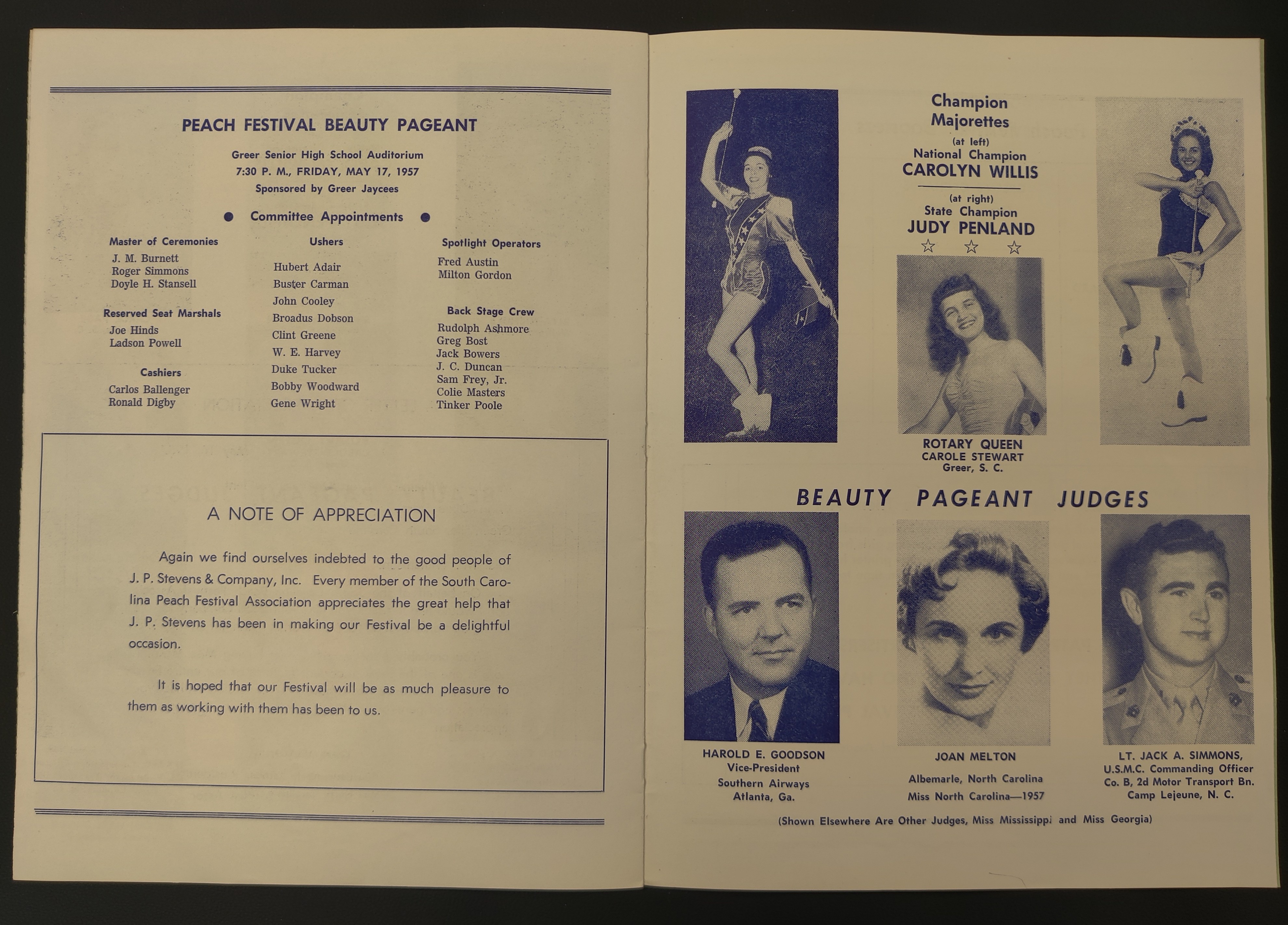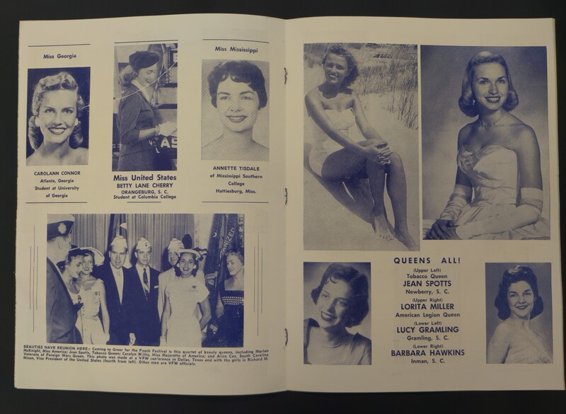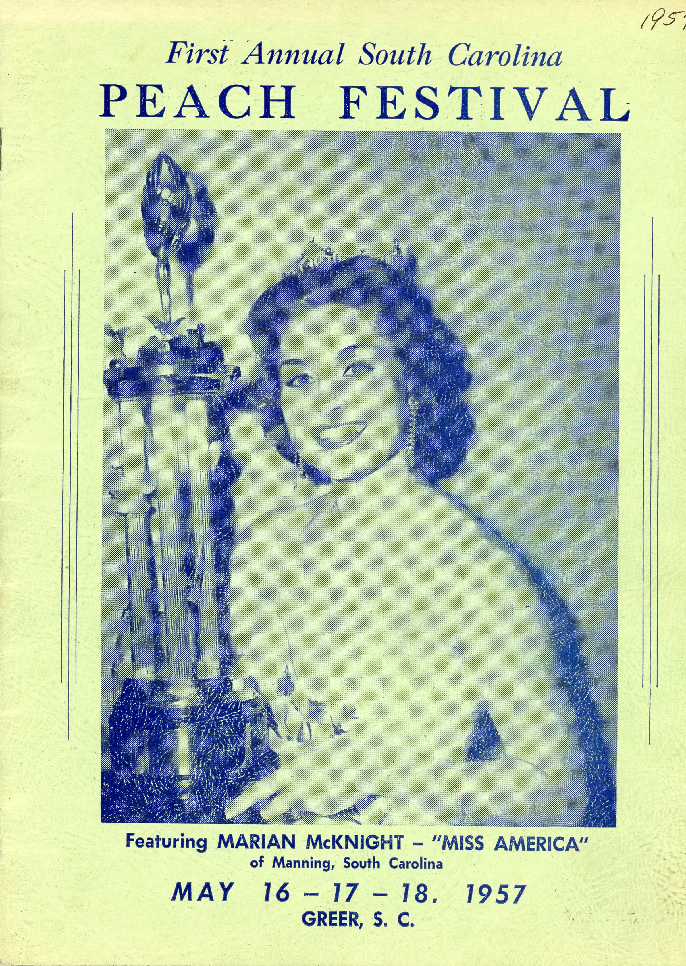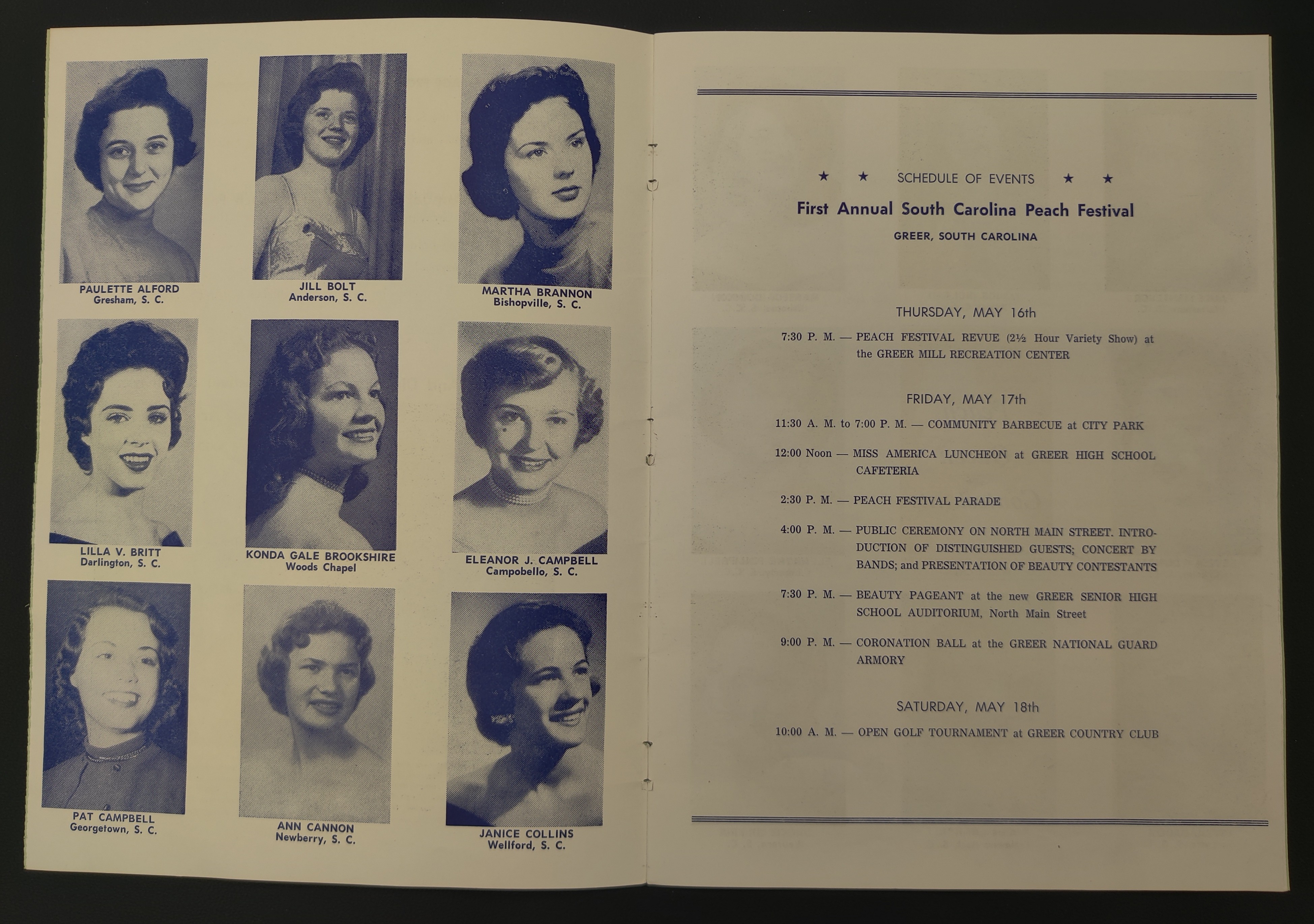 - A program for the 1957 Peach Festival including photographs of Peach Queens contestants, lists of committees and boosters, a festival itinerary, and festival purpose statement (1996.36.1 duplicate)