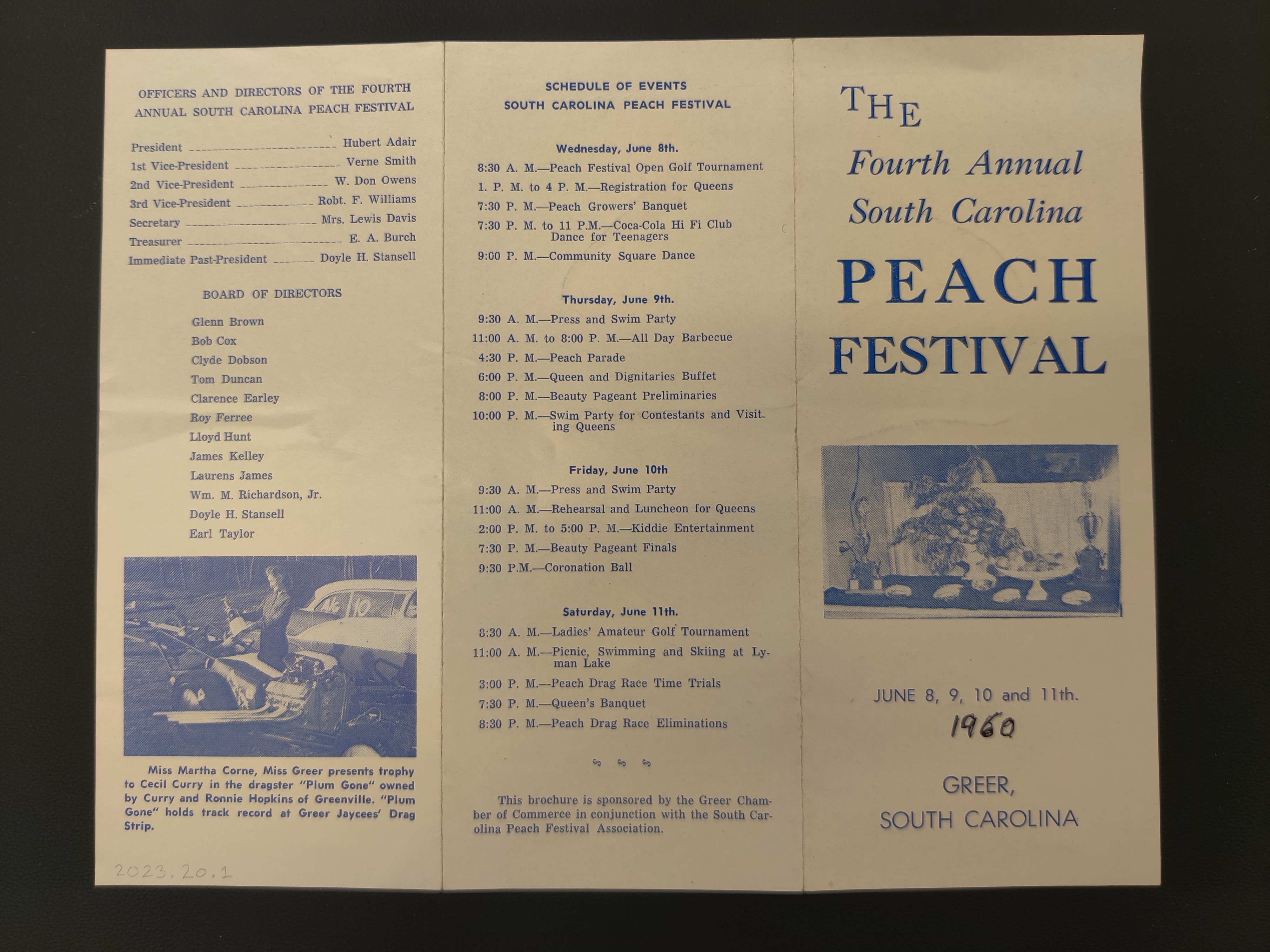 - A brochure for the 1960 Peach Festival including a description of the festival, a schedule of events, and a list of festival officials