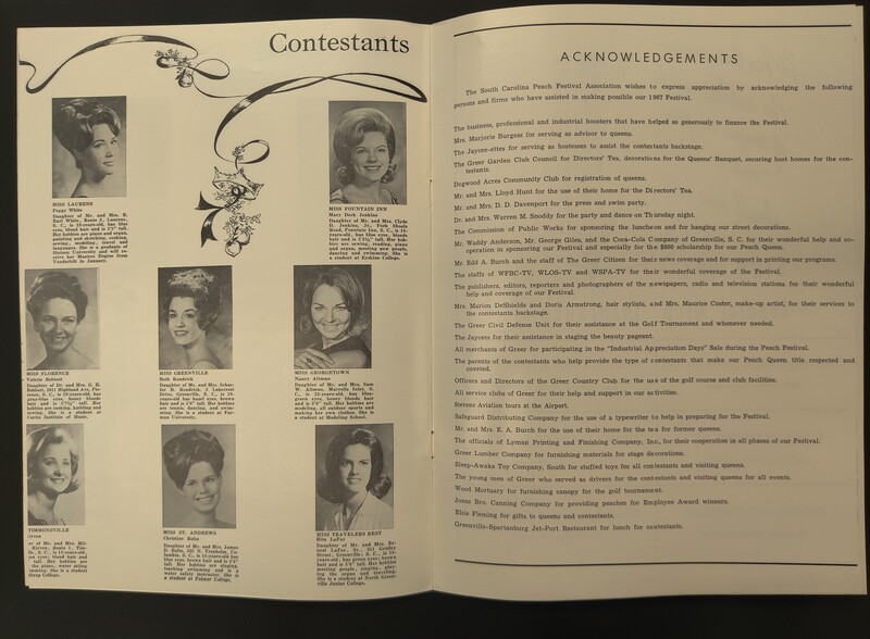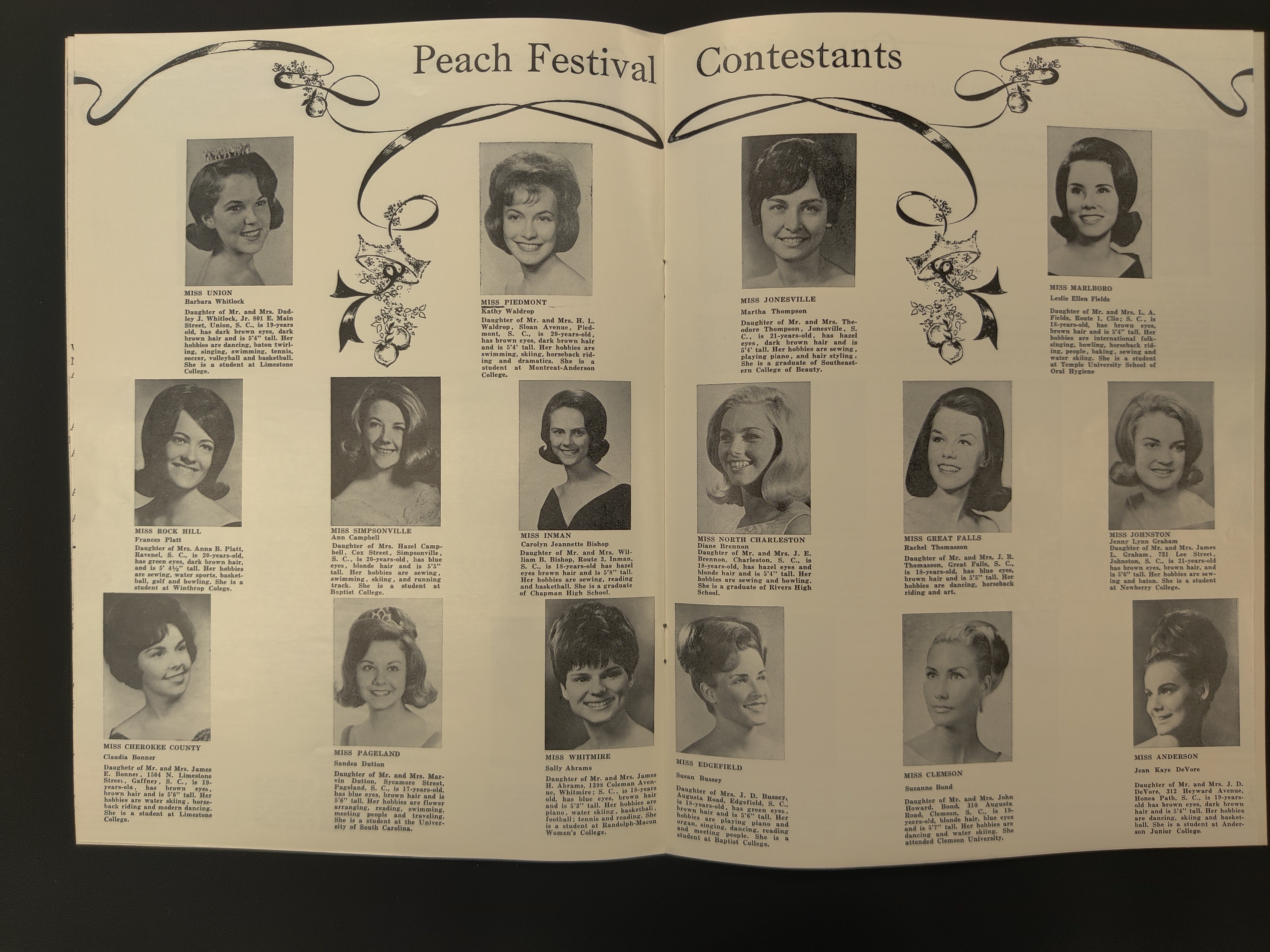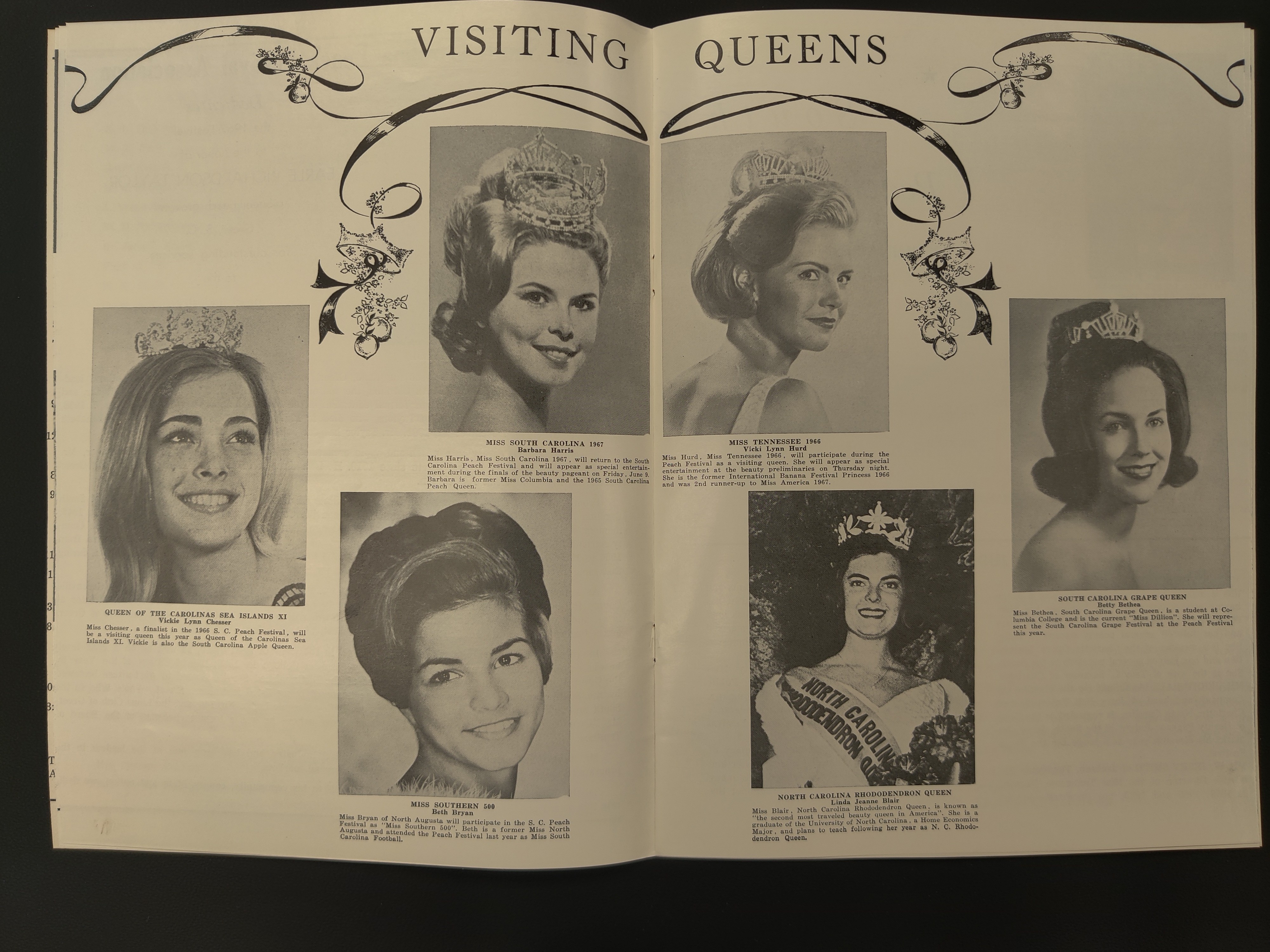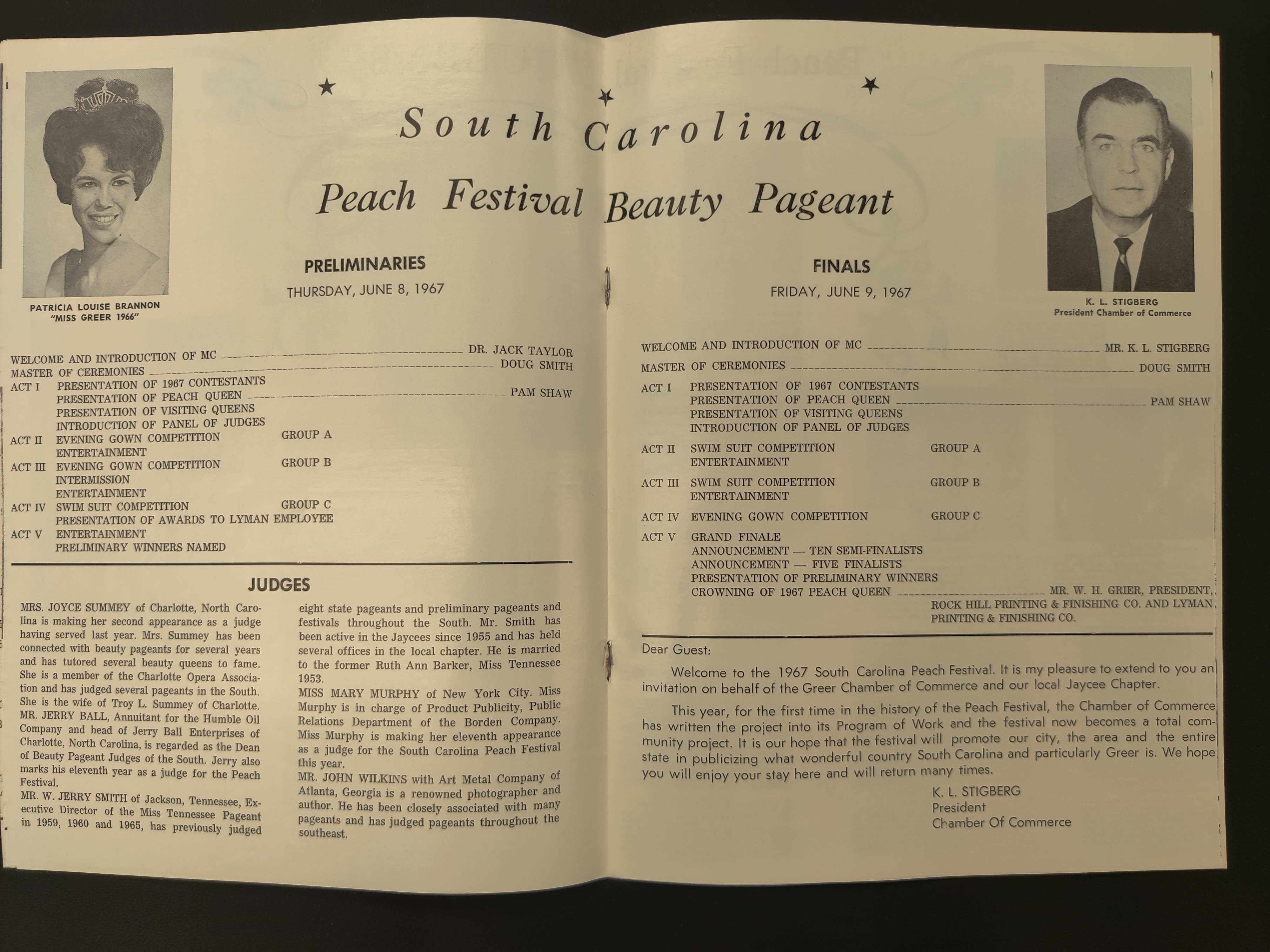 - A program for the 1967 Peach Festival including a schedule of events, photos of Peach Queen contestants and visiting queens, and other information about the featival