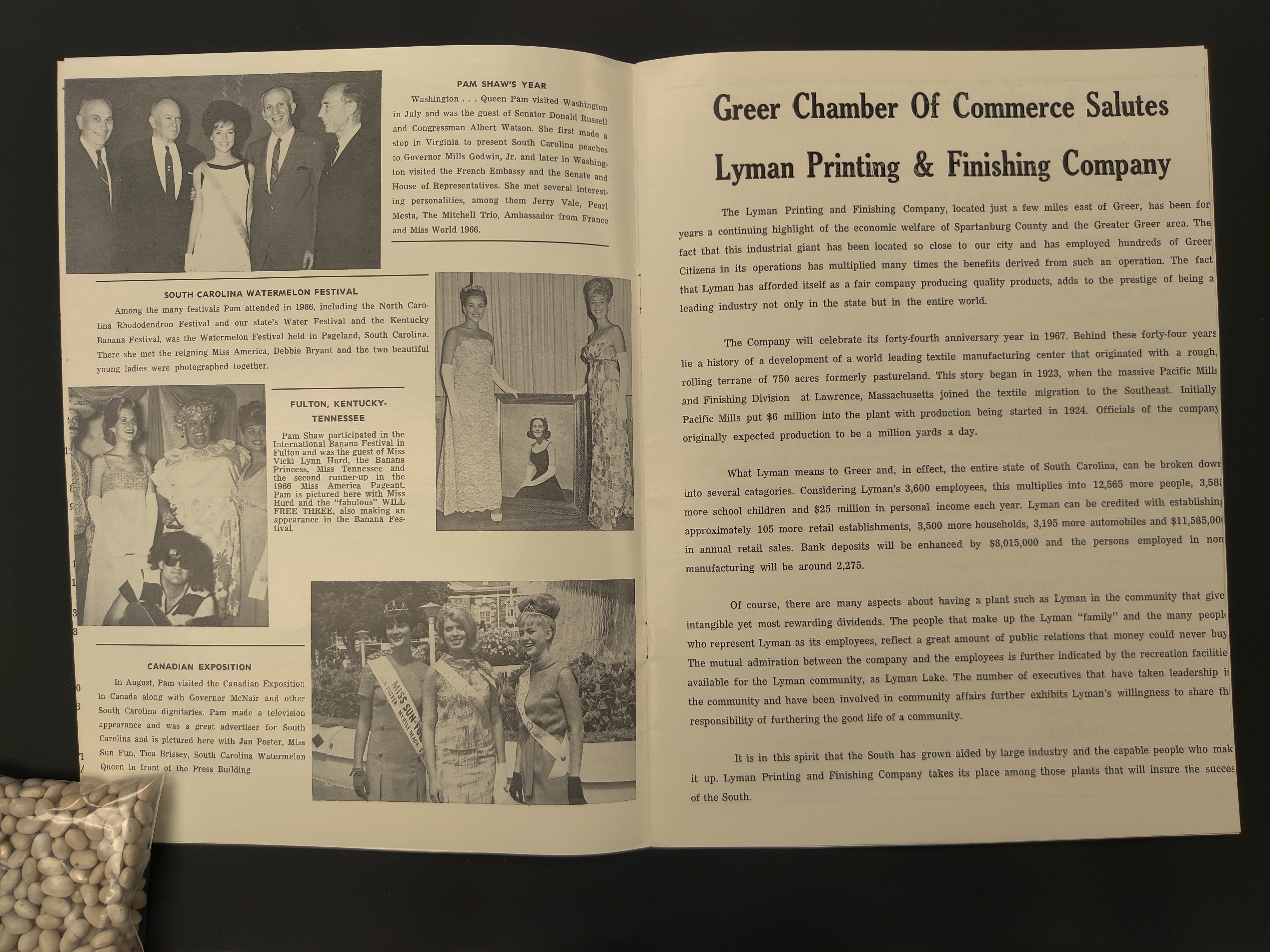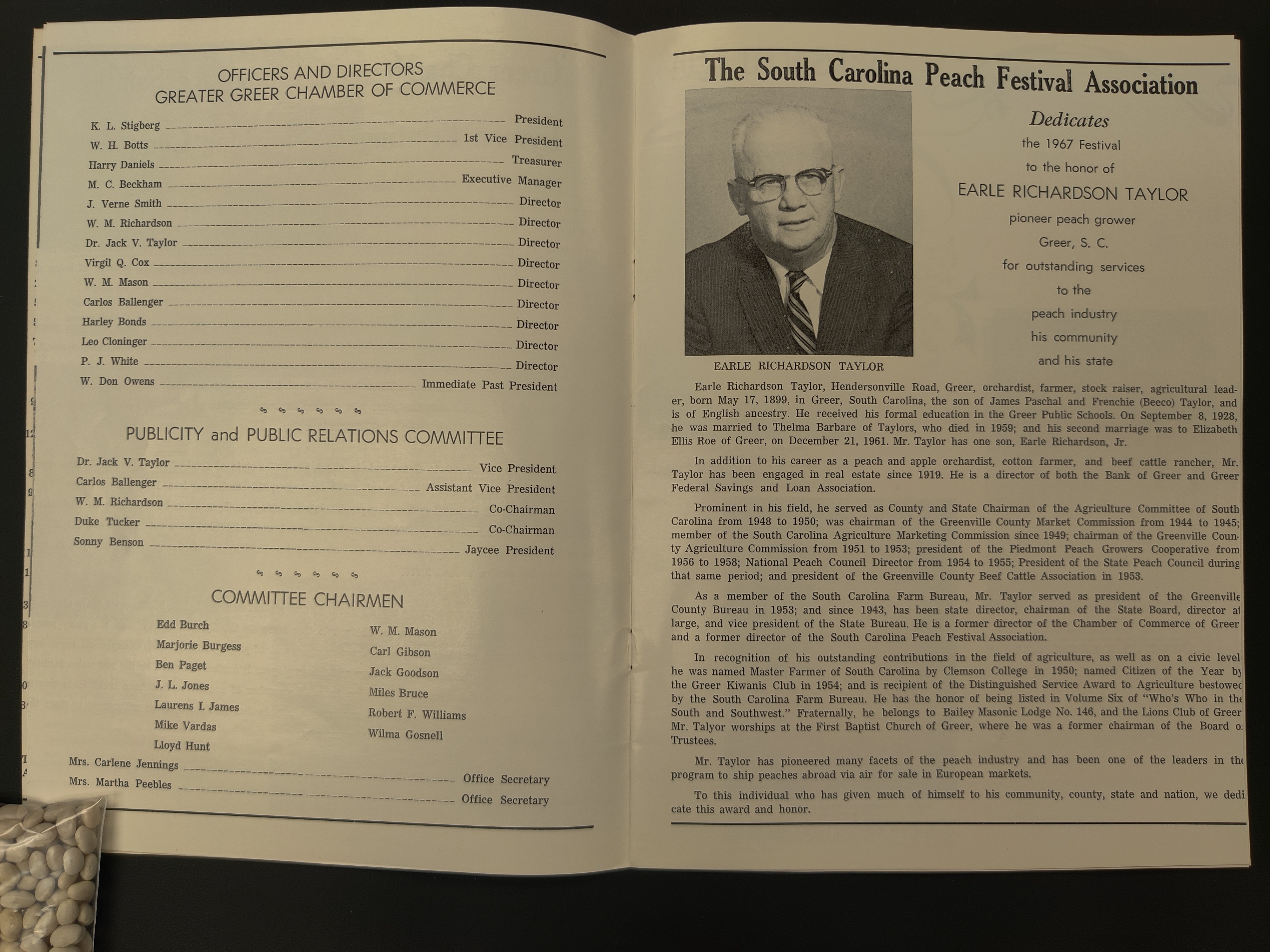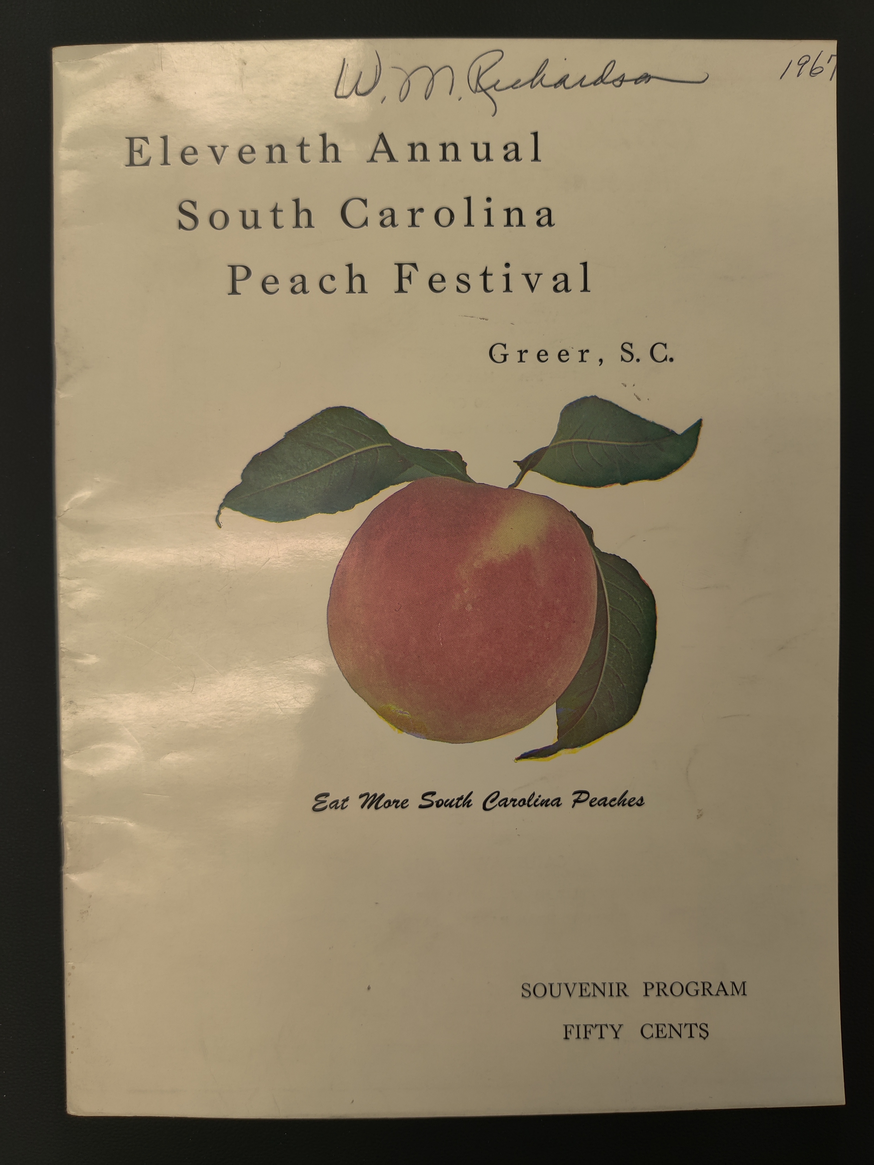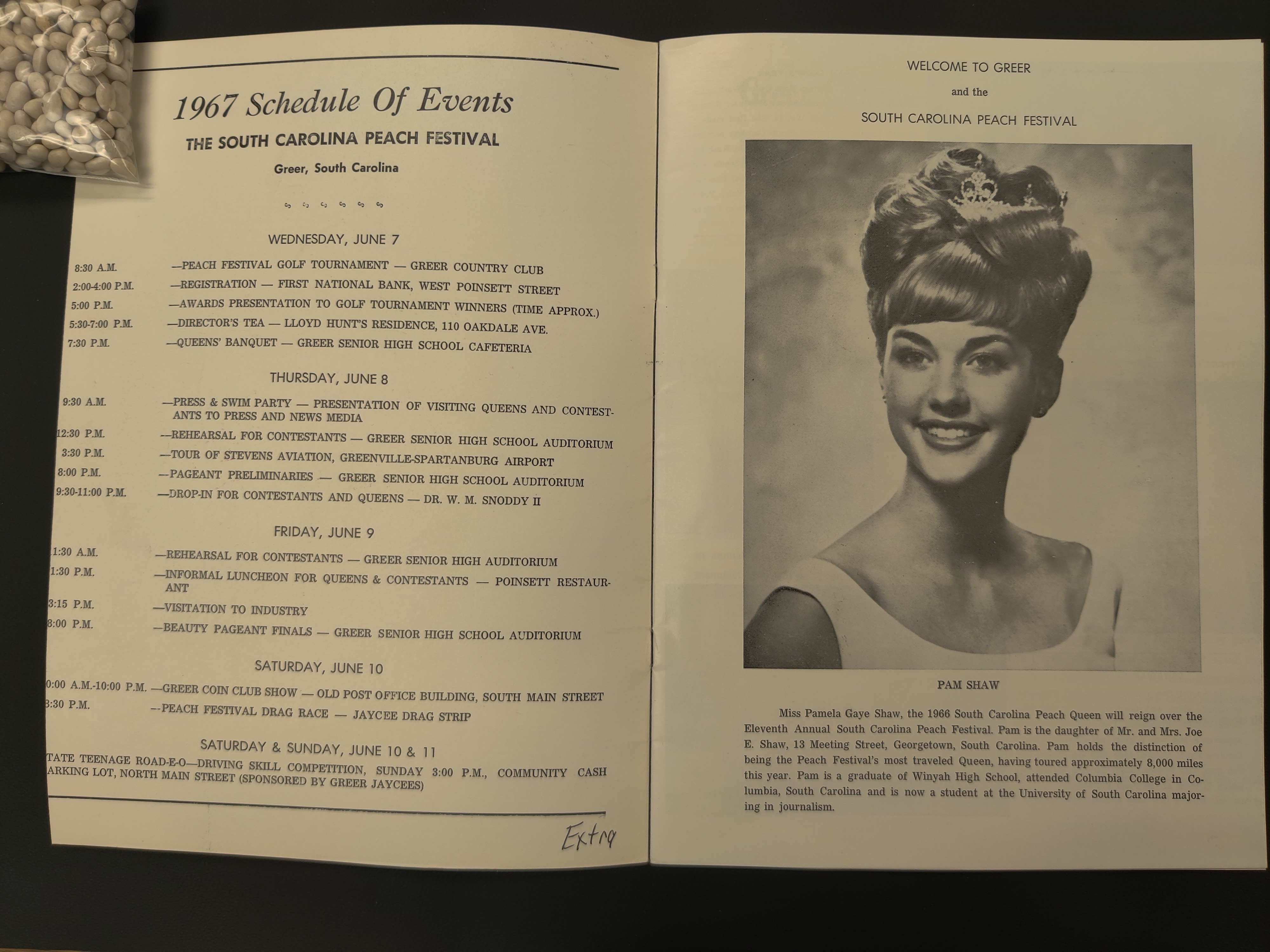 - A program for the 1967 Peach Festival including a schedule of events, photos of Peach Queen contestants and visiting queens, and other information about the featival