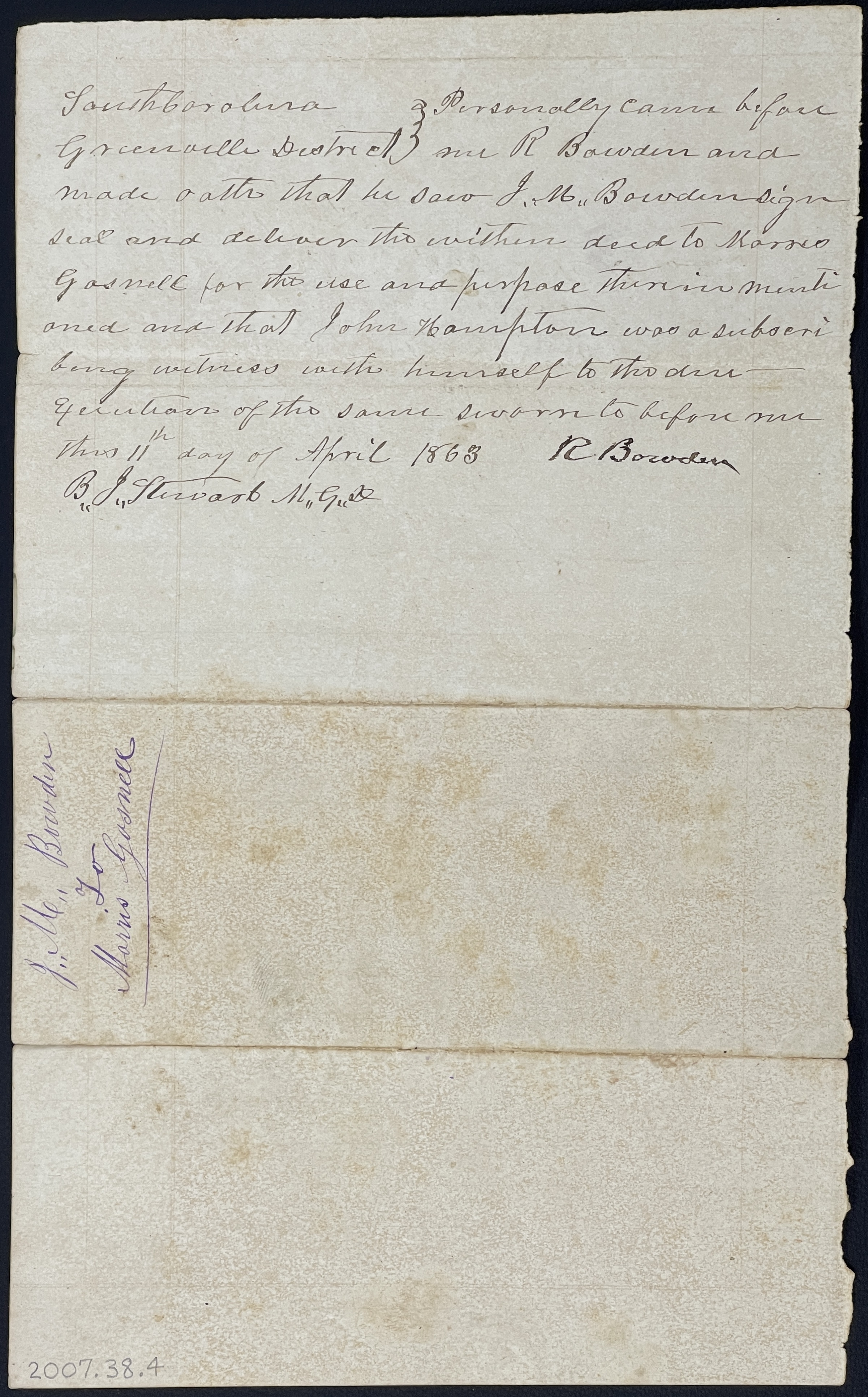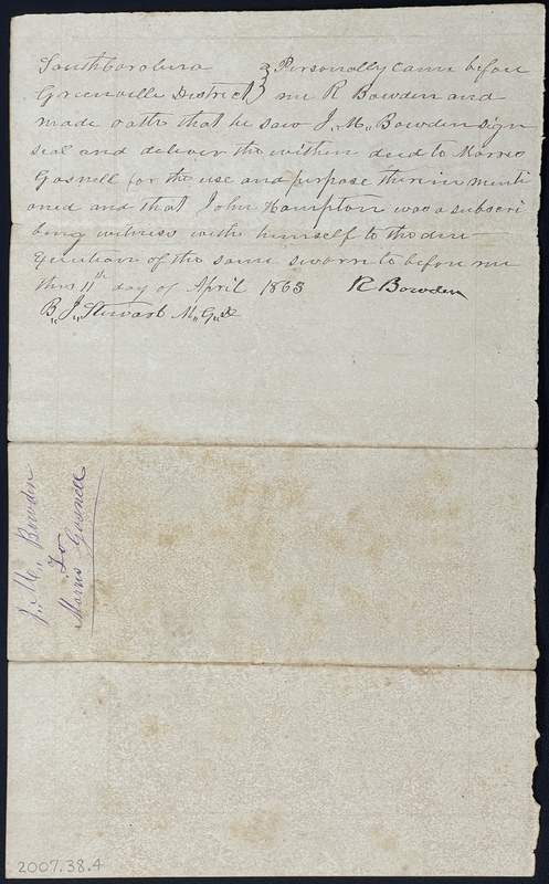Personally came before me R Bowden and made oath that he saw J.M. Bowden sign seal and deliver the within deed to Morris Gosnell for the use and purpose therein mentioned and that John Hampton was a subscribing witness with himself to the deed — Execution of the same sworn to before me this 11th day of April 1863 R Bowden