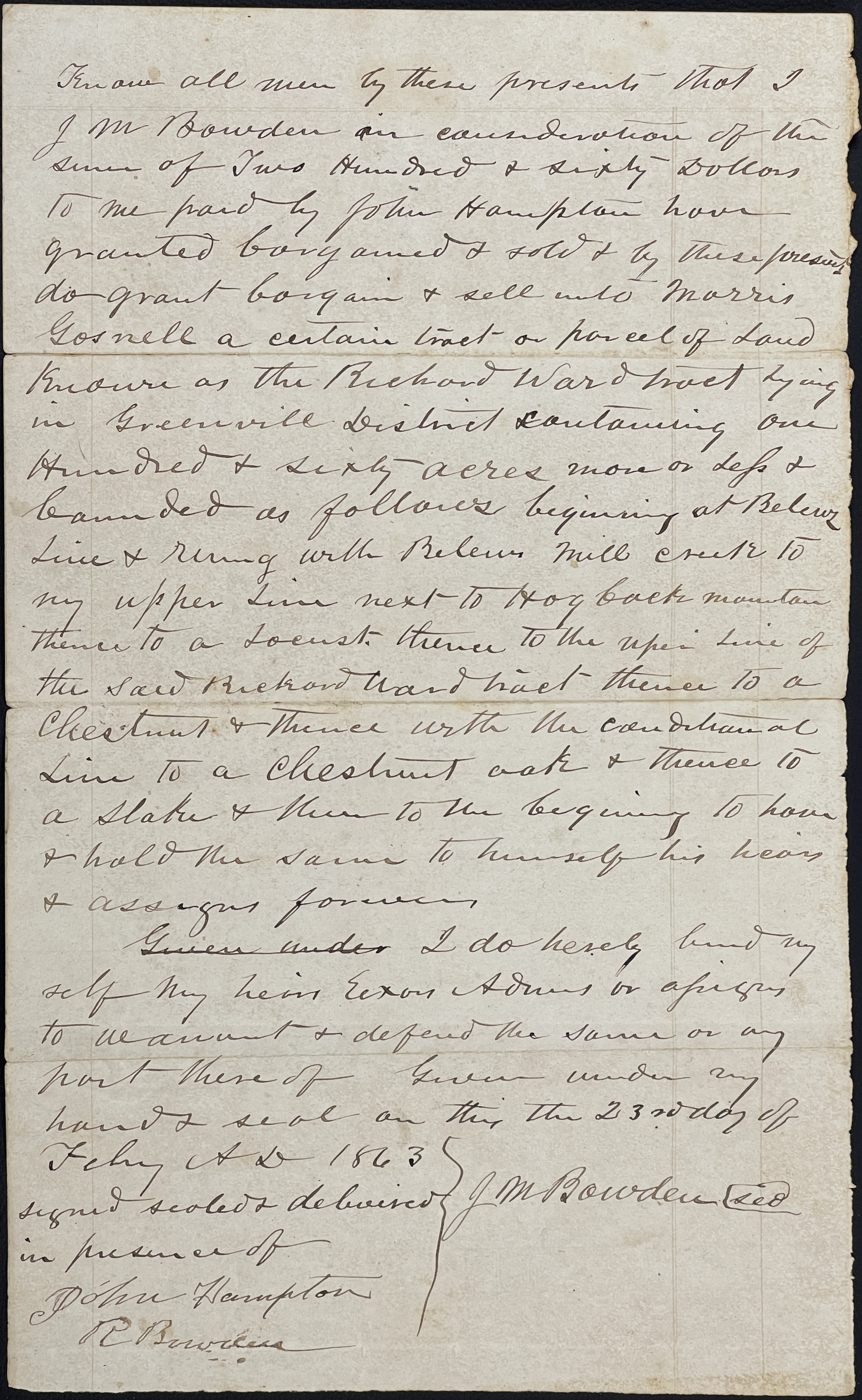 To all men by these presents that I J M Bowden in consideration of the sum of Two Hundred and Sixty Dollars to me paid by John Hampton have granted bargained & sold & by these presents do grant bargain & sell unto Morris Gosnell a certain tract or parcel ofLand known as the Richard Ward tract lying in Greenville District containing one Hundred & sixty acres more or less & bounded as follows beginning at Belews Line & running with Belews Mill Creek to my upper Line next to Hogback Mountain thence to a Locust. thence to the upper line of the said Richard Ward tract thence to a Chestnut & thence with the conditional line to a Chestnut oak & thence to a stake & thence to the beginning to have & to hold the same to himself his hears & assigns forever.