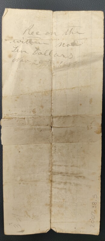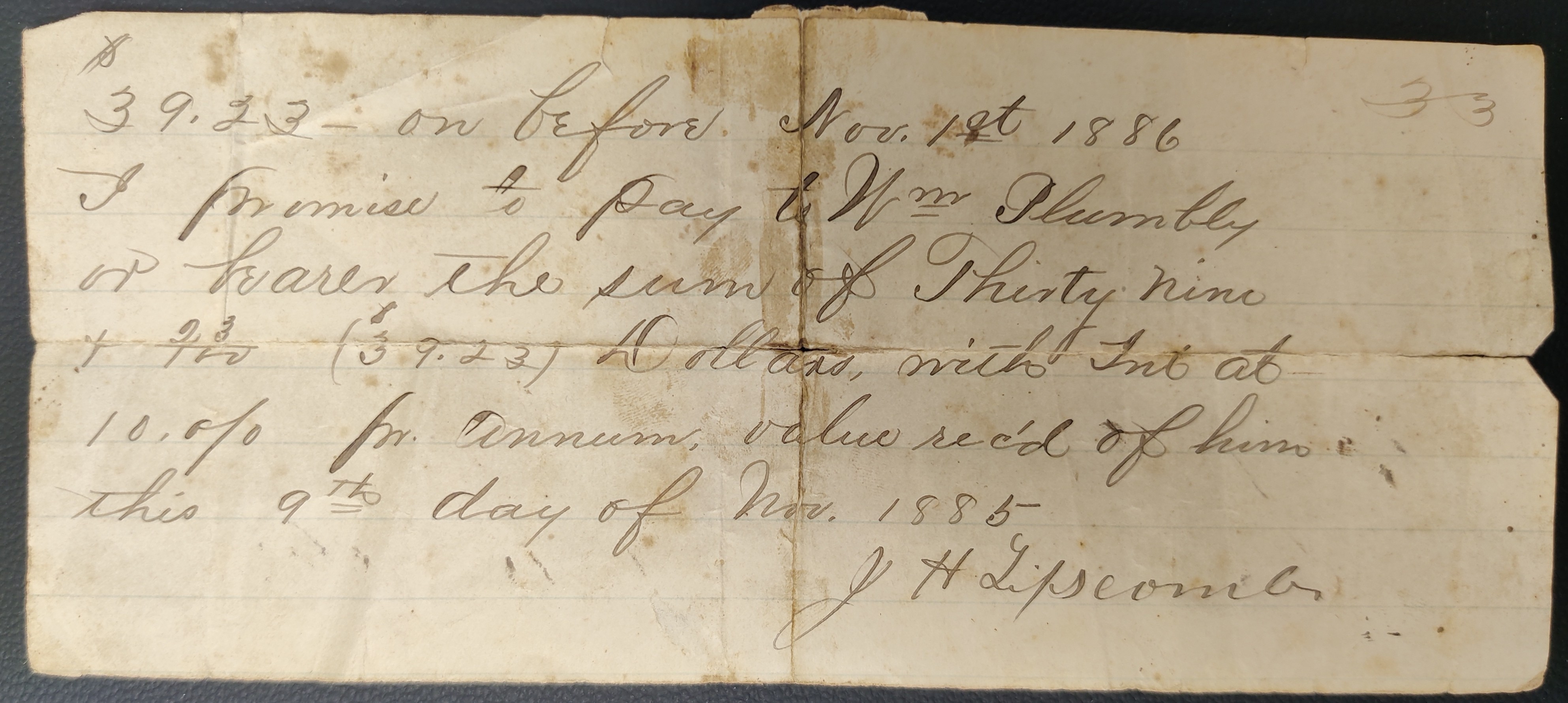 $39.23 — on before Nov. 1st 1886 I promise to pay to Wm Plumbly or bearer the sum of Thirty nine & 23/100 ($39.23) Dollars, with Int at 10.% pr. annum, value rec'd of him this 9th day of Nov. 1885.