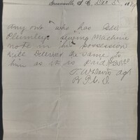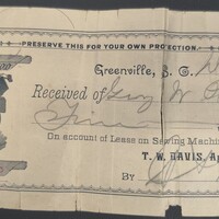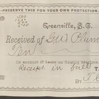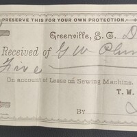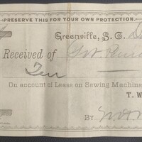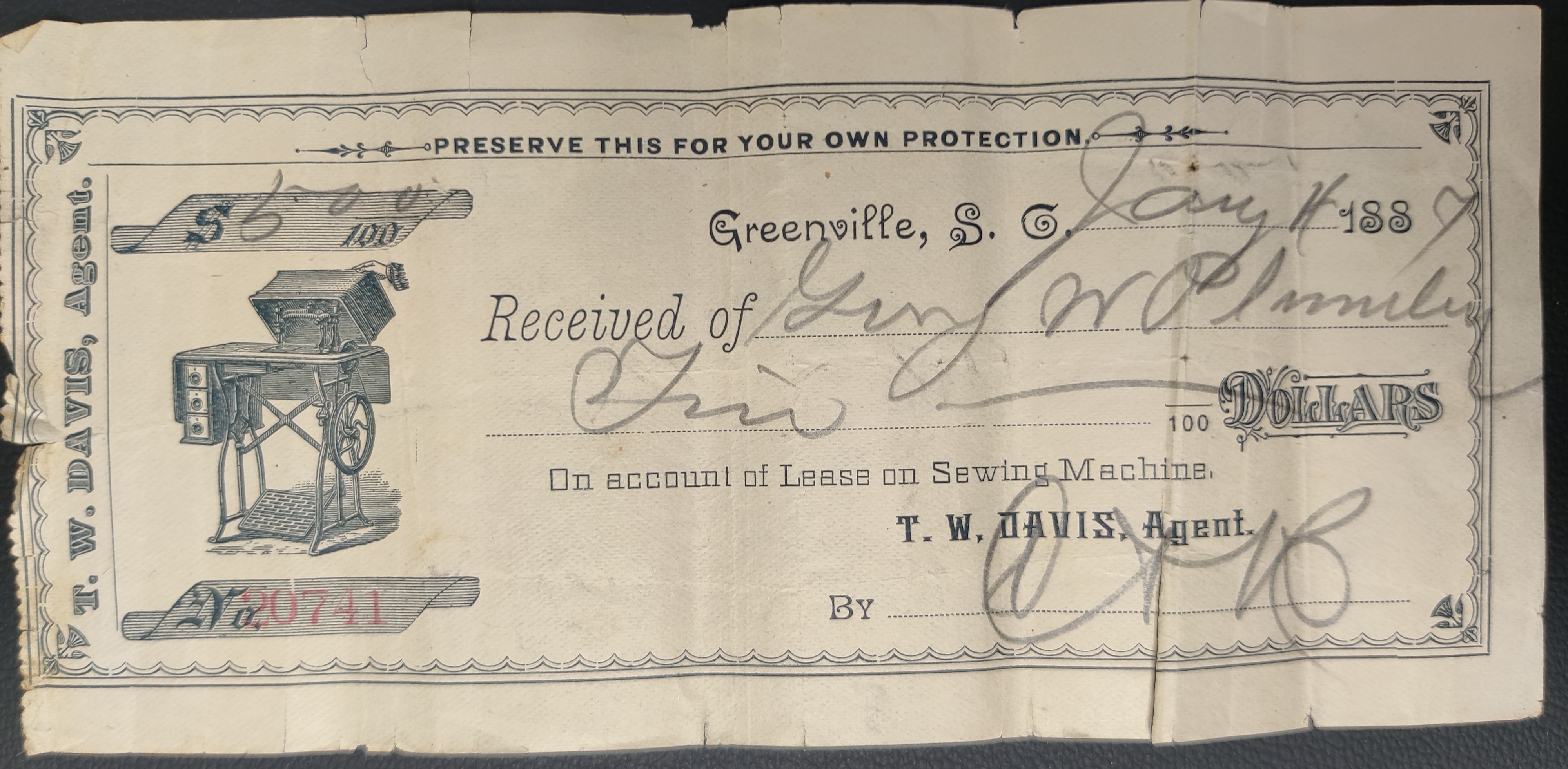 - $5.00 payment received of Gen. W Plumley, Jany 4, 1887 by T.W. Davis, agent, for a sewing machine.