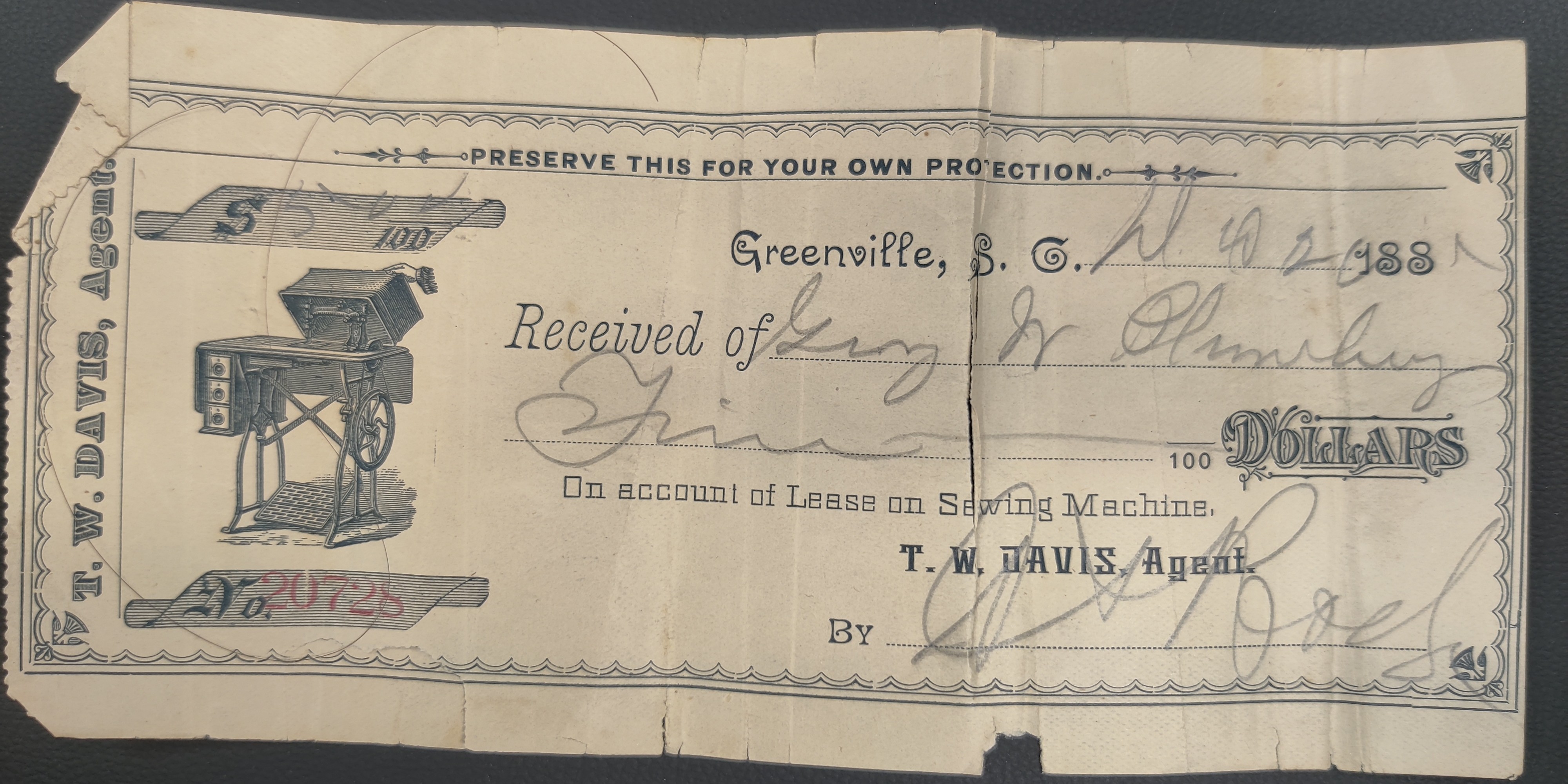 T.W. Davis receipt for sewing machine
