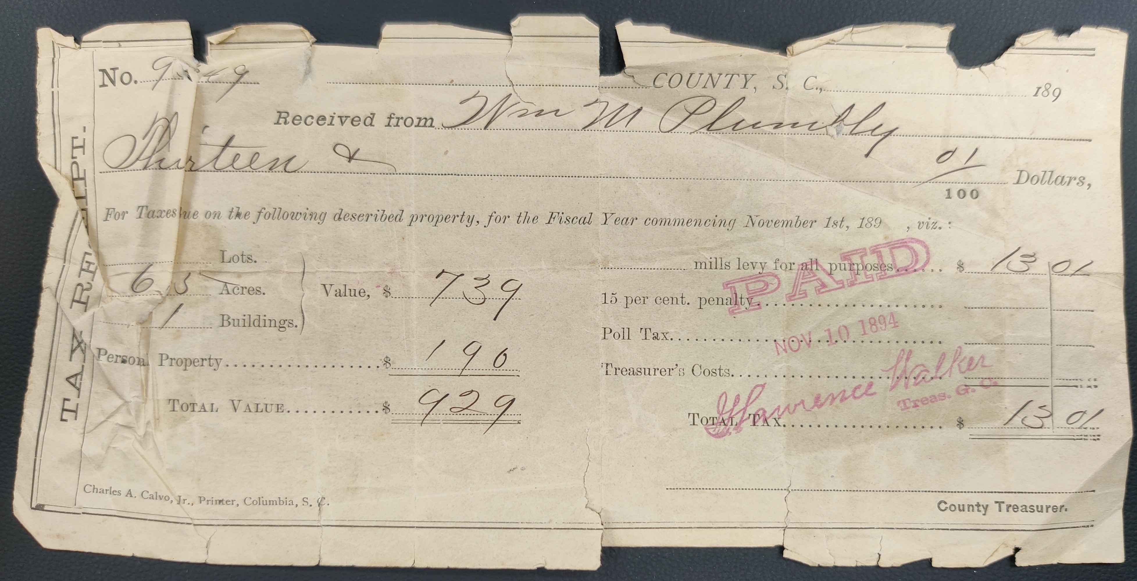 - County tax receipt for WM Plumbley Nov. 10, 1894