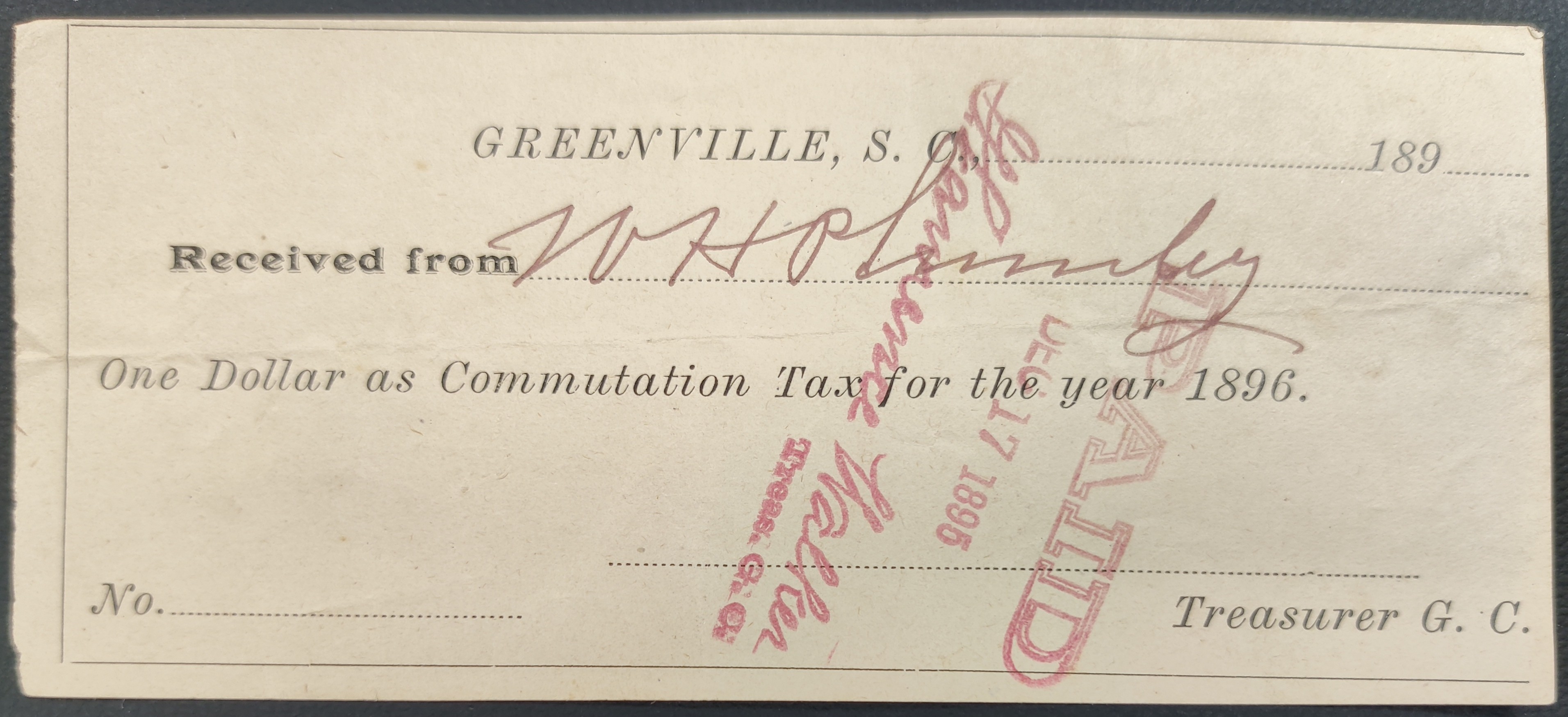 - Receipt for one dollar of Commutation Tax for the year 1896. Paid by WH Plumley on December 17, 1895.