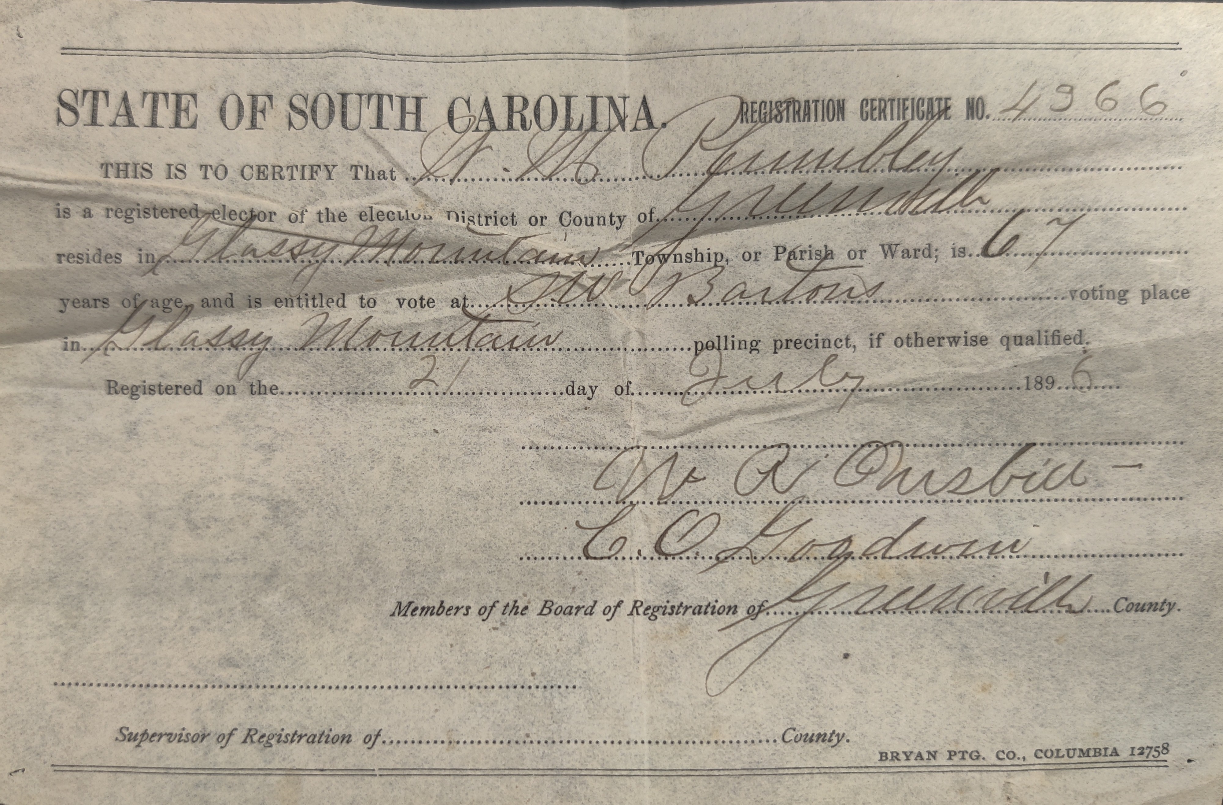 - State of South Carolina voter registration certificate for W. M. Plumbley in 1896.