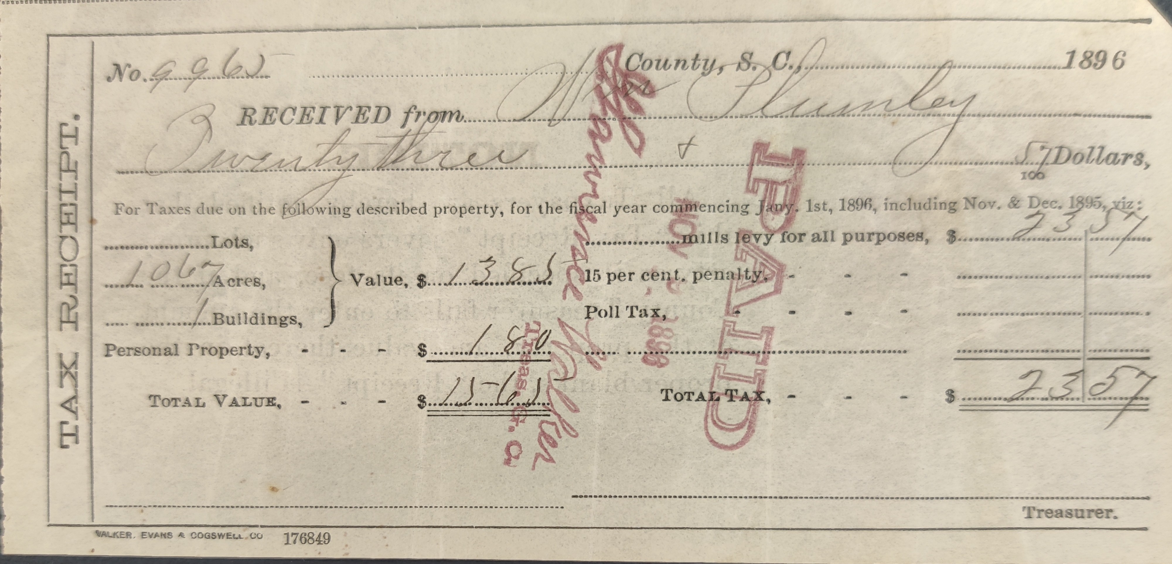 - Greenville County tax receipt for Wm Plumley. Levied on 1,067 acres with 1 building, valued at $1,385; and personal property of $180, for a total value of $1,565. Total tax of $23.57 marked PAID November 9, 1896.