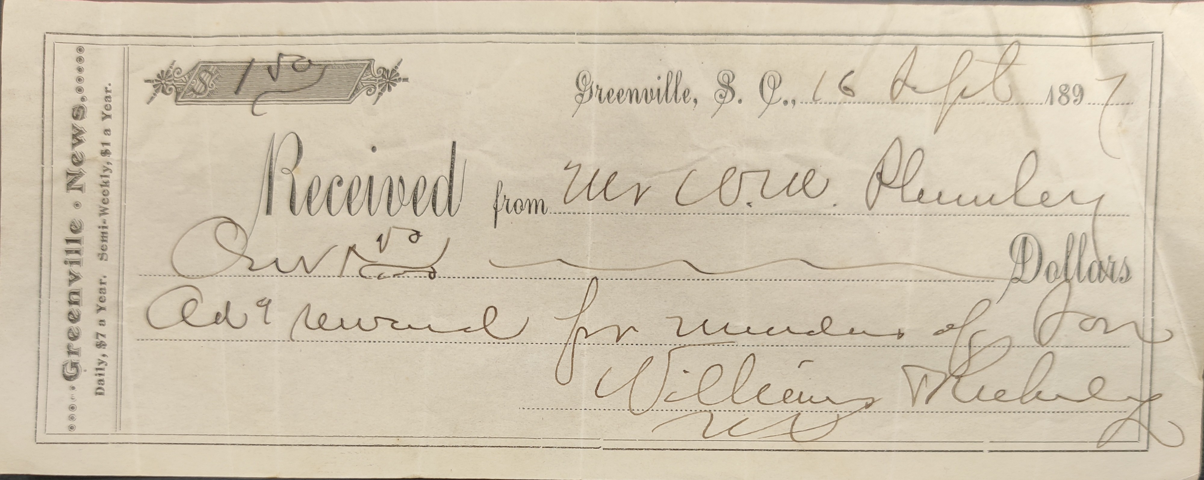 Greenville News receipt dated Sept. 16, 1897. Received $1.50 from W.M. Plumley for "Ad & reward for murder of Son." The reward was $200.