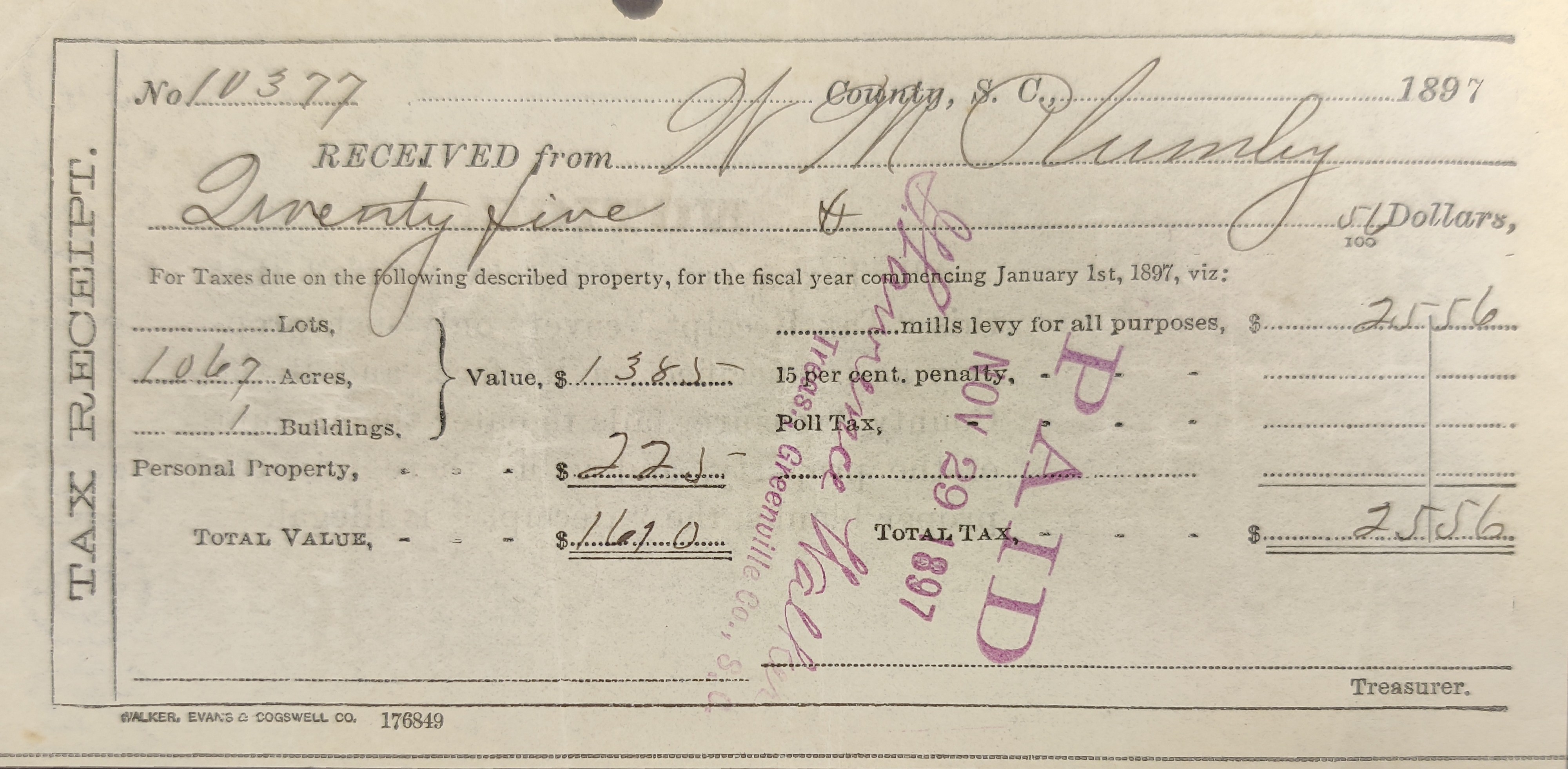 County tax receipt for Wm Plumley, Nov 29, 1897