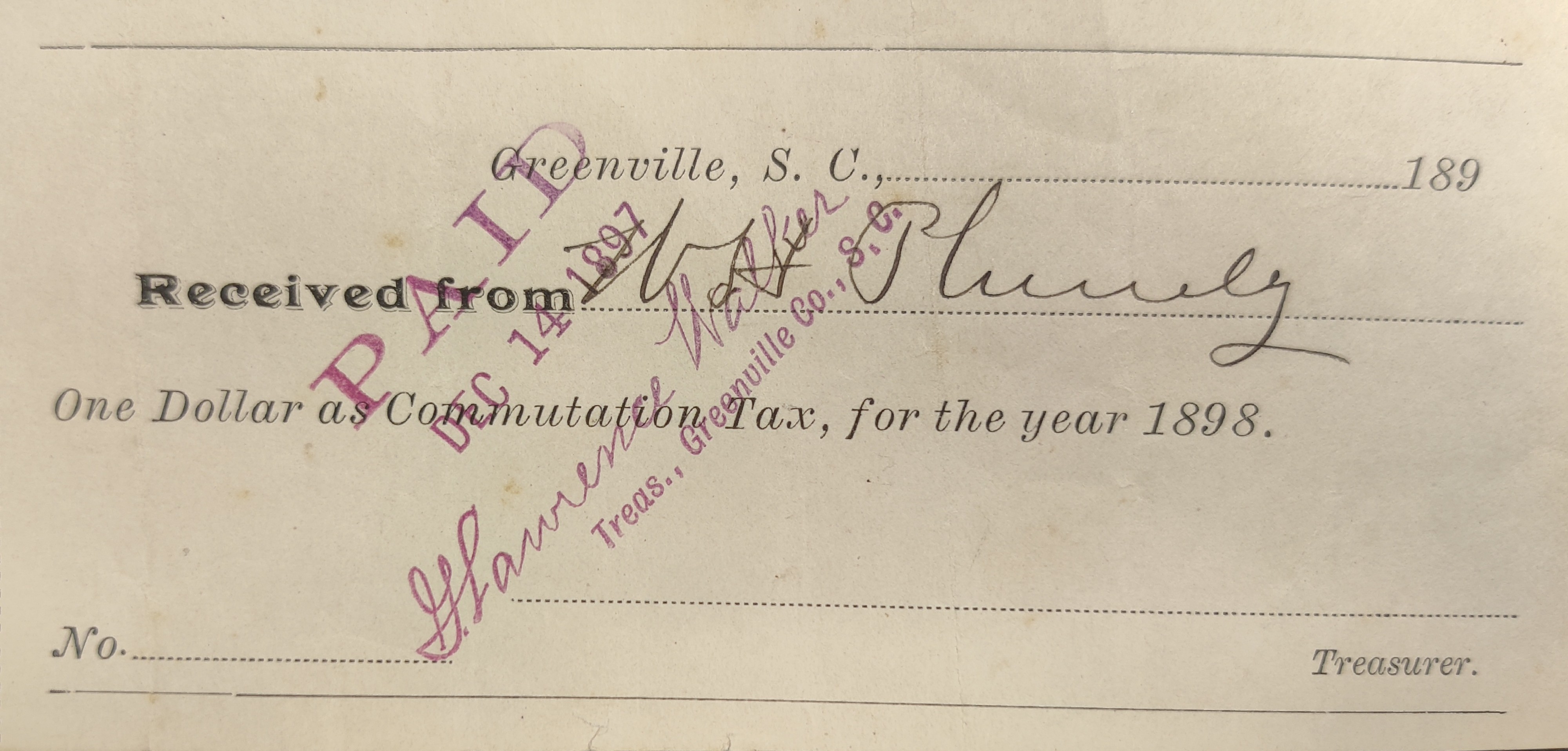 - Greenville County tax receipt to W H Plumly on One Dollar as Cummutation Tax, for 1898.