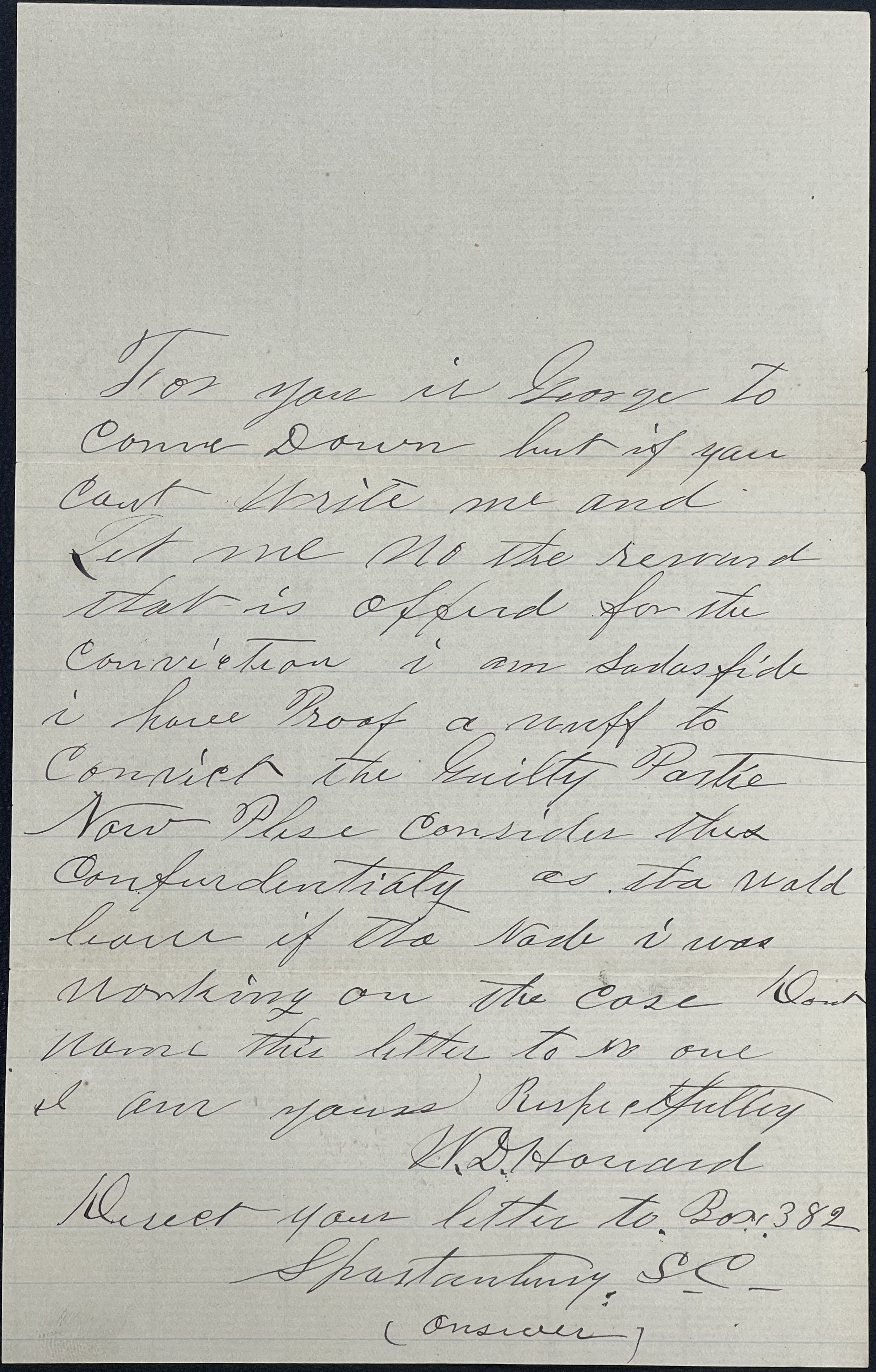 I wold like to see you in regard to this matter I wold off Talk to you the other Day a bout it but I Did not want them to think i was working on the Case I wold be Glad For you in George to Come Down but if you cant Write me and Let me No the reward that is offerd for the Conviction i am Sadasfide i have Proof a nuff to Convict the Guilty Partie