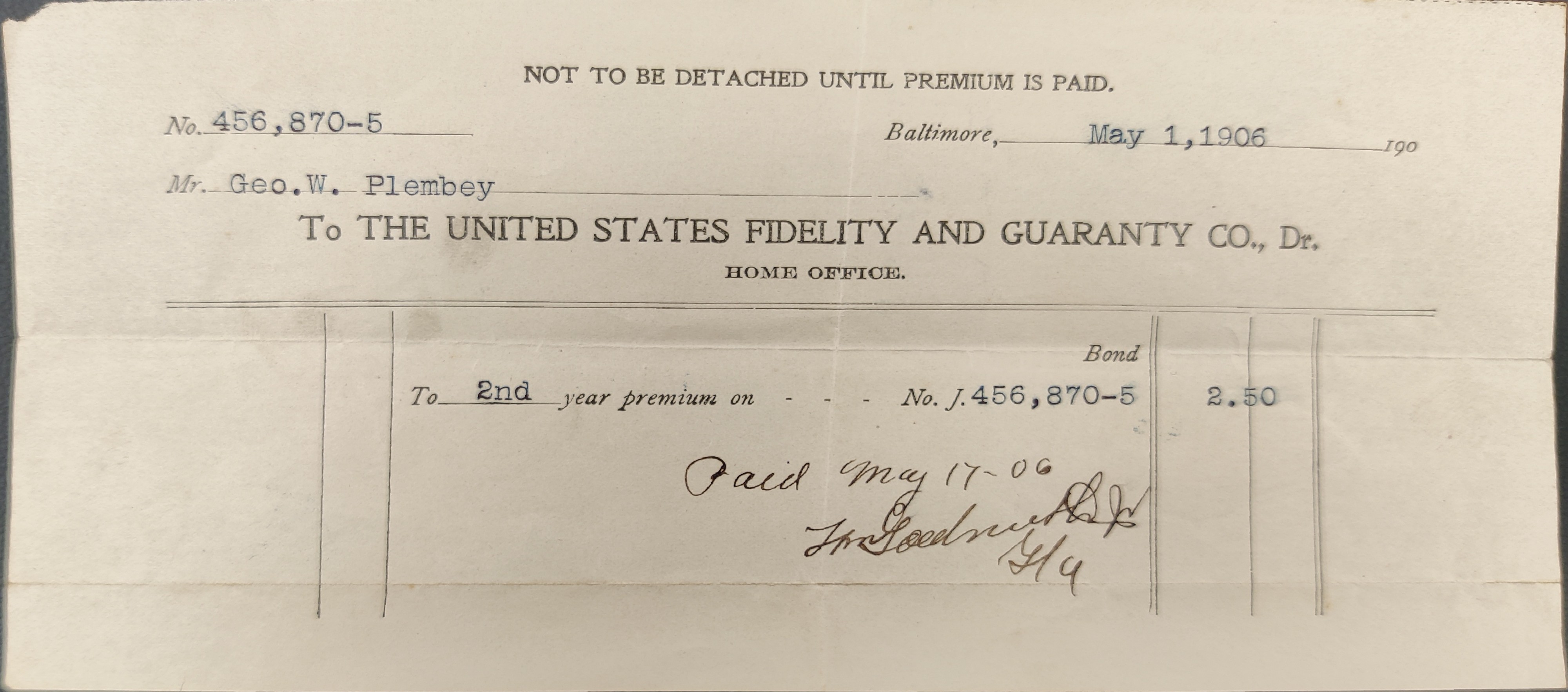 - Receipt for Mr. Geo. W. Plembey, to the United States Fidelity and Guaranty Co., Dr. Home Office. To the 2nd year premium on Bond No. J. 456,870-5, $2.50. Paid May 17, 1906 signed Wm Goldsmith, Jr. G/A