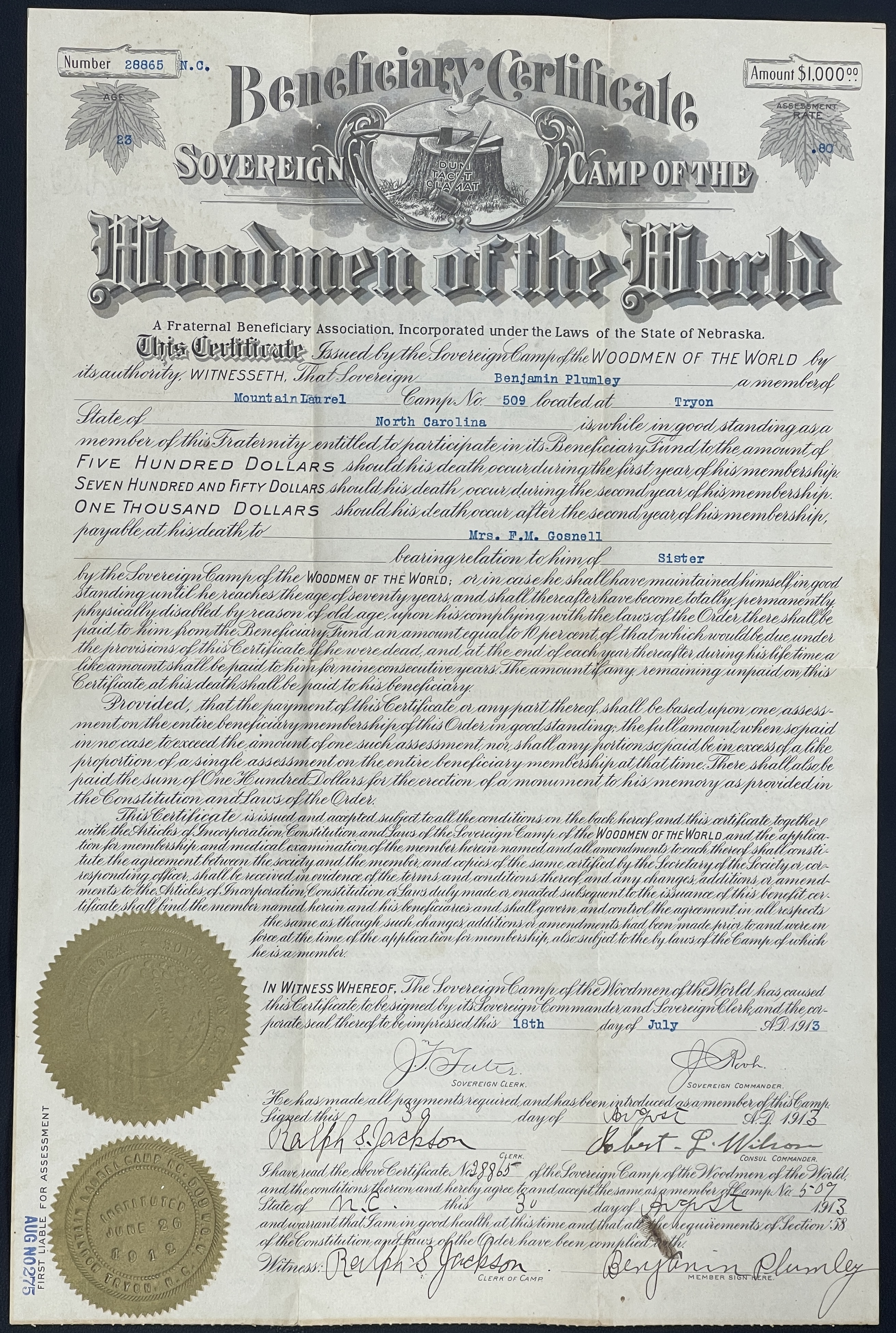 - Beneficiary Certificate number 28865 in the amount of $1000 for Sovereign Benjamin Plumley, payable at death to his sister, Mrs. F. M. Gosnell