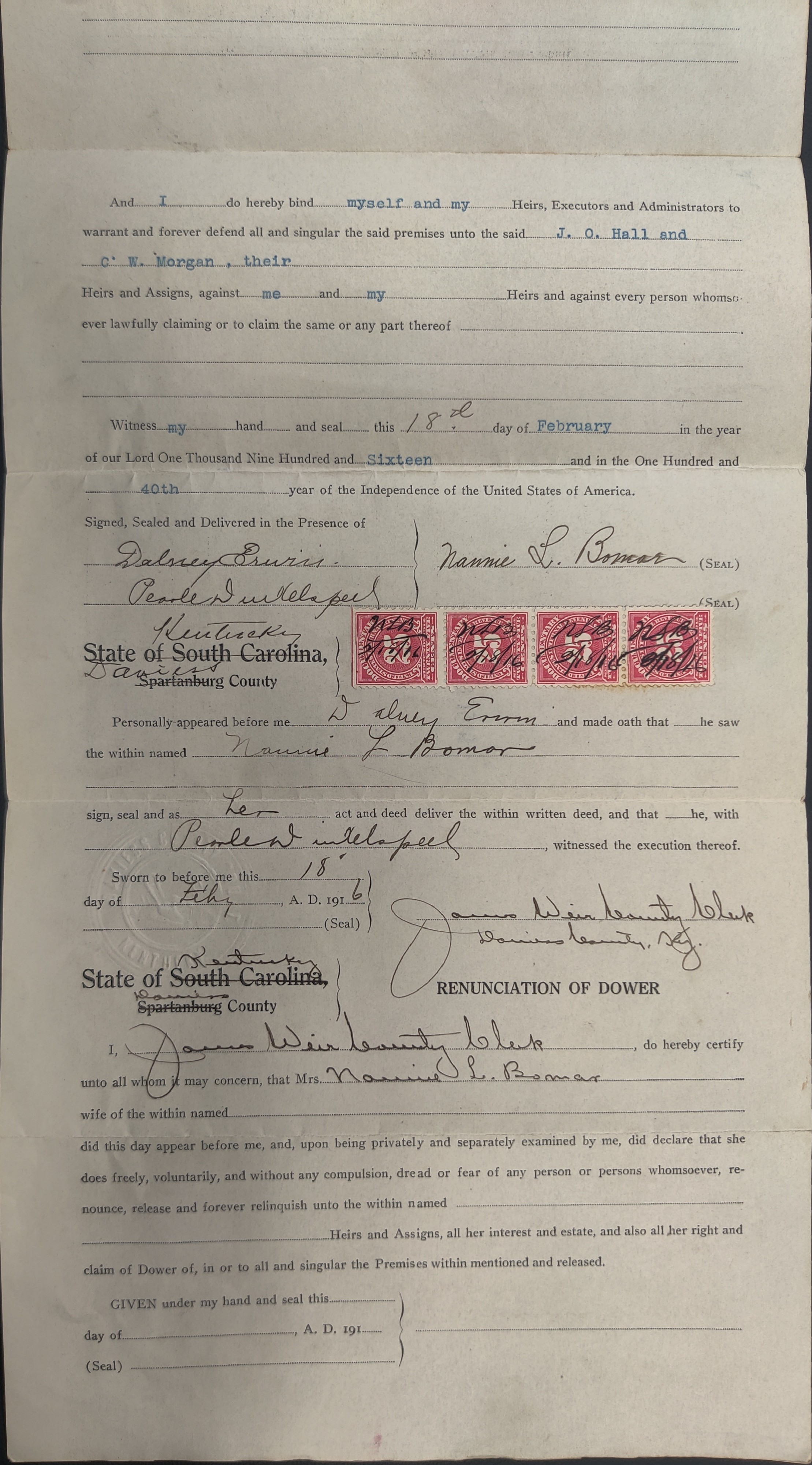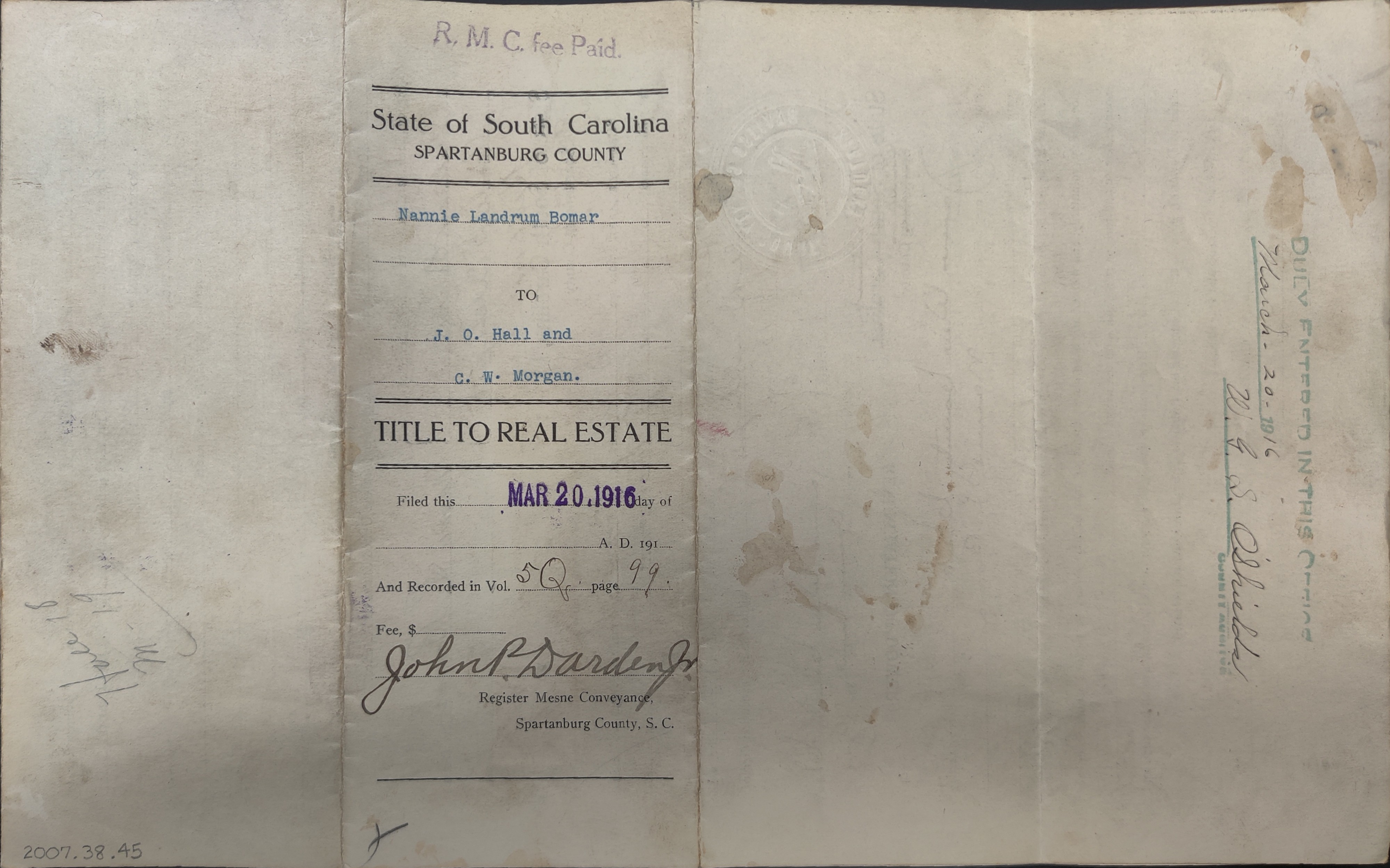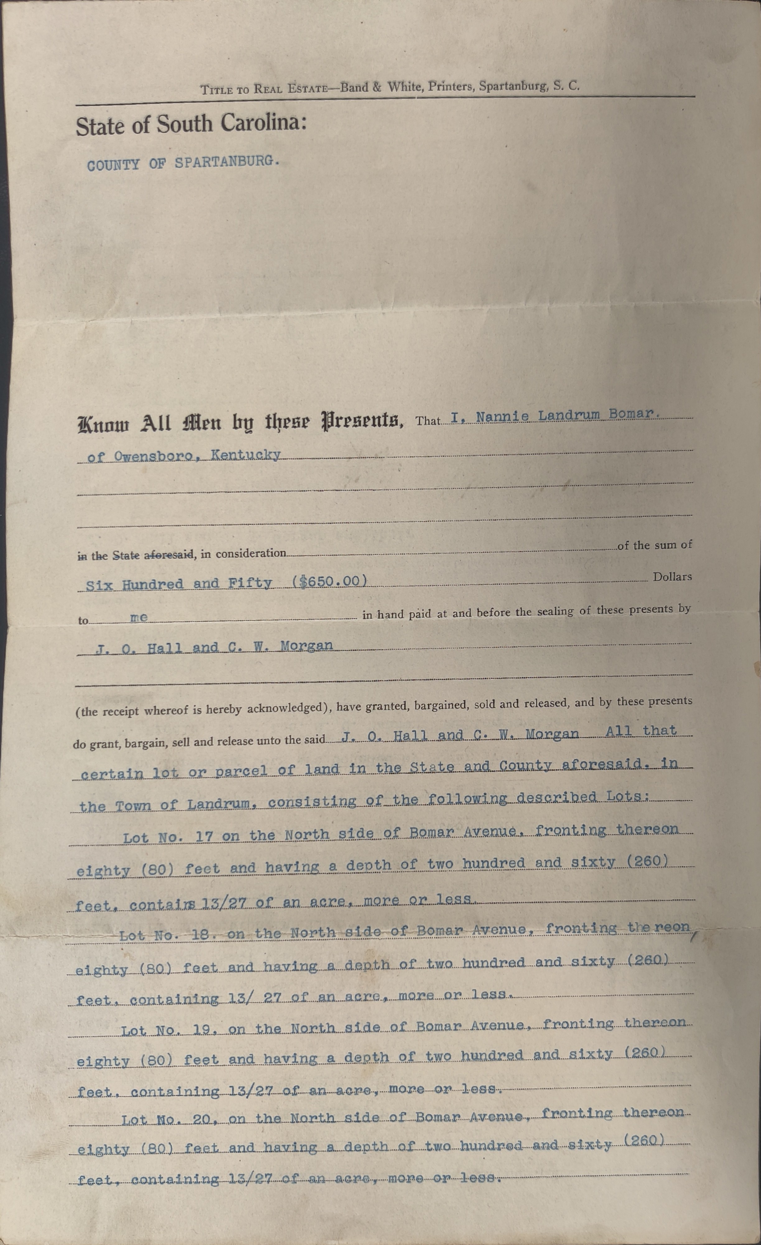 - Real Estate title: Nannie Landrum Bomar to JO Hall and CW Morgan