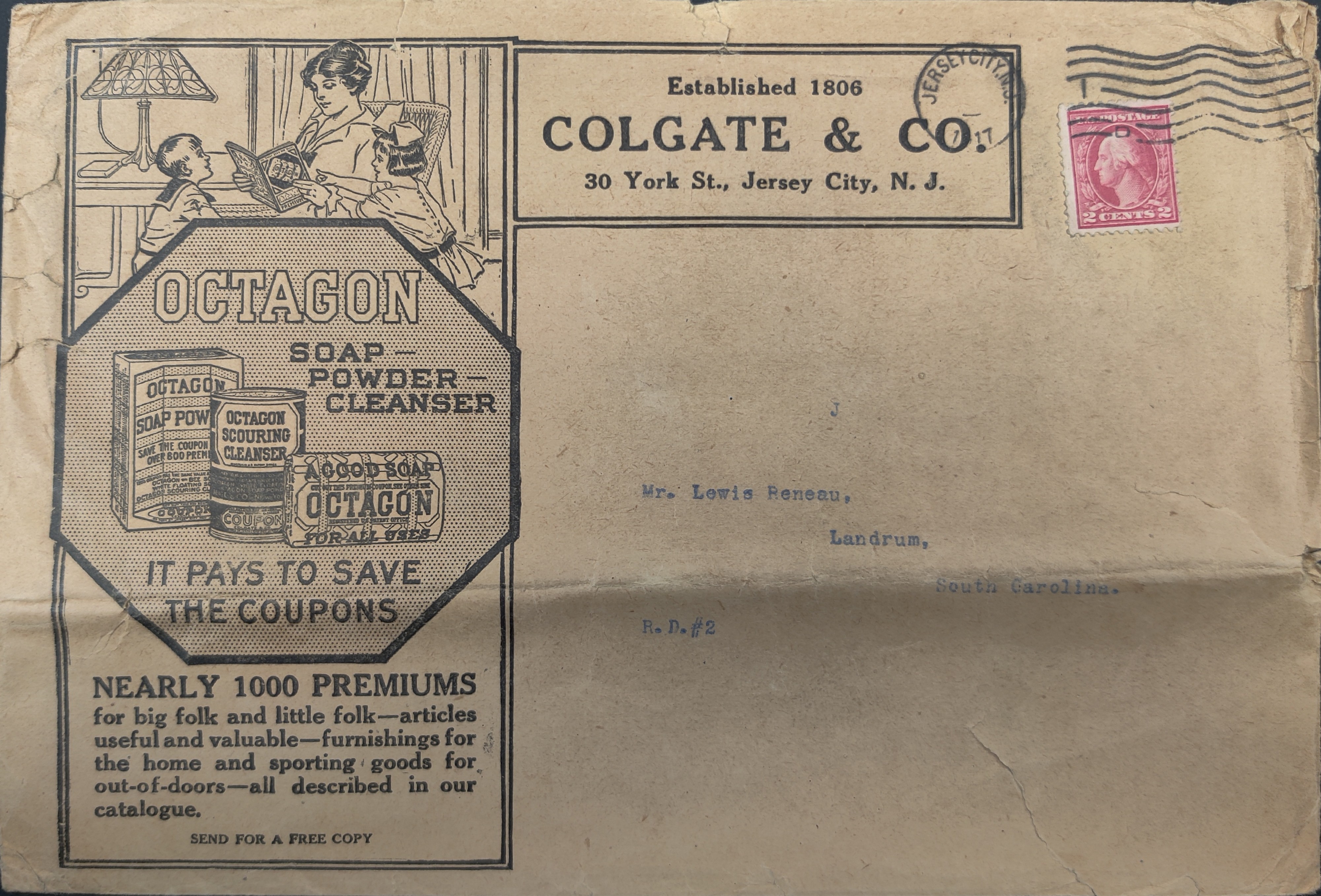 Empty envelope sent from Colgate & Co., 30 York St., Jersey City, N. J. to Mr. Lewis Beneau, Landrum, South Carolina. R.D.#2