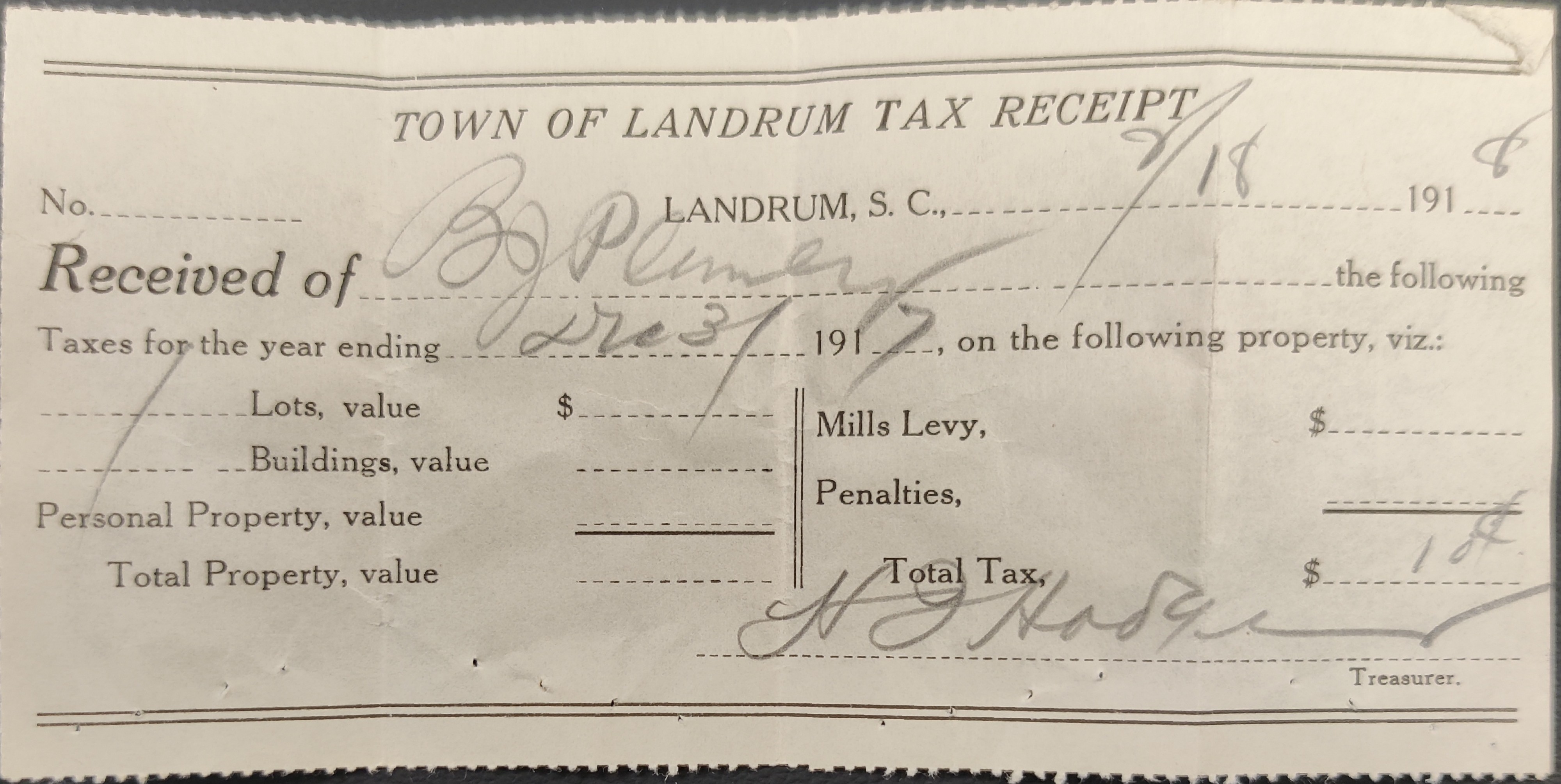 - Town of Landrum tax receipt. Received of BJ Plumly taxes for the year ending Dec 31 1917, total tax of $1.04.