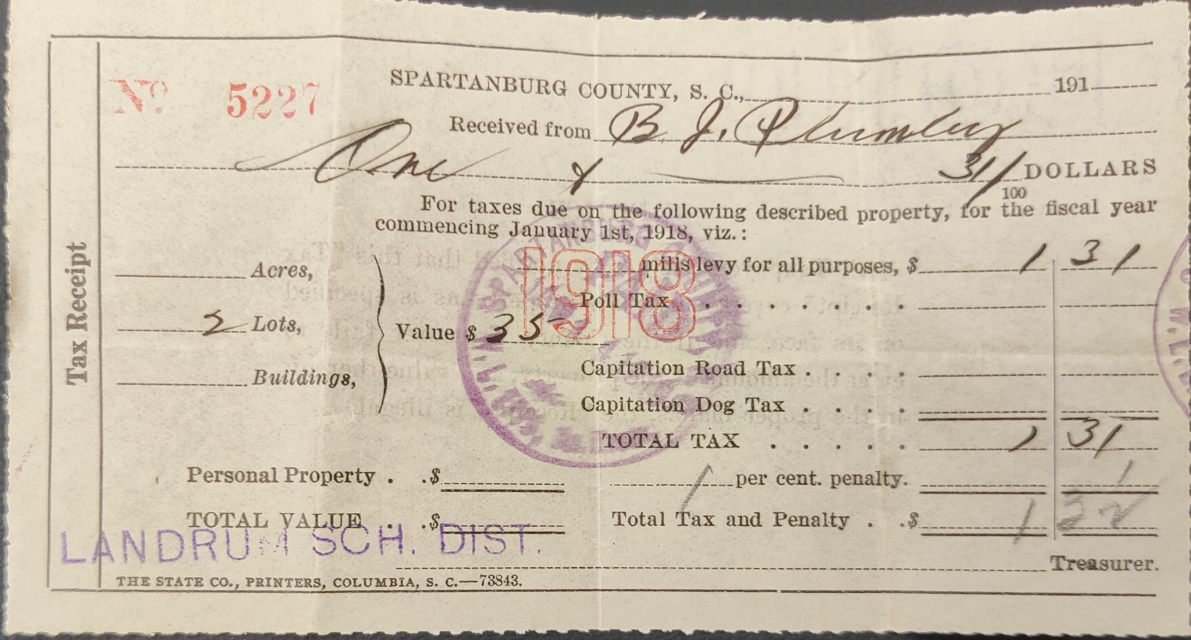 - Spartanburg Co., SC tax receipt. From B. J. Plumley, $1.32. Of that, $1.31 was for taxes due on 2 lots valued at $35; the other penny was a 1% penalty.