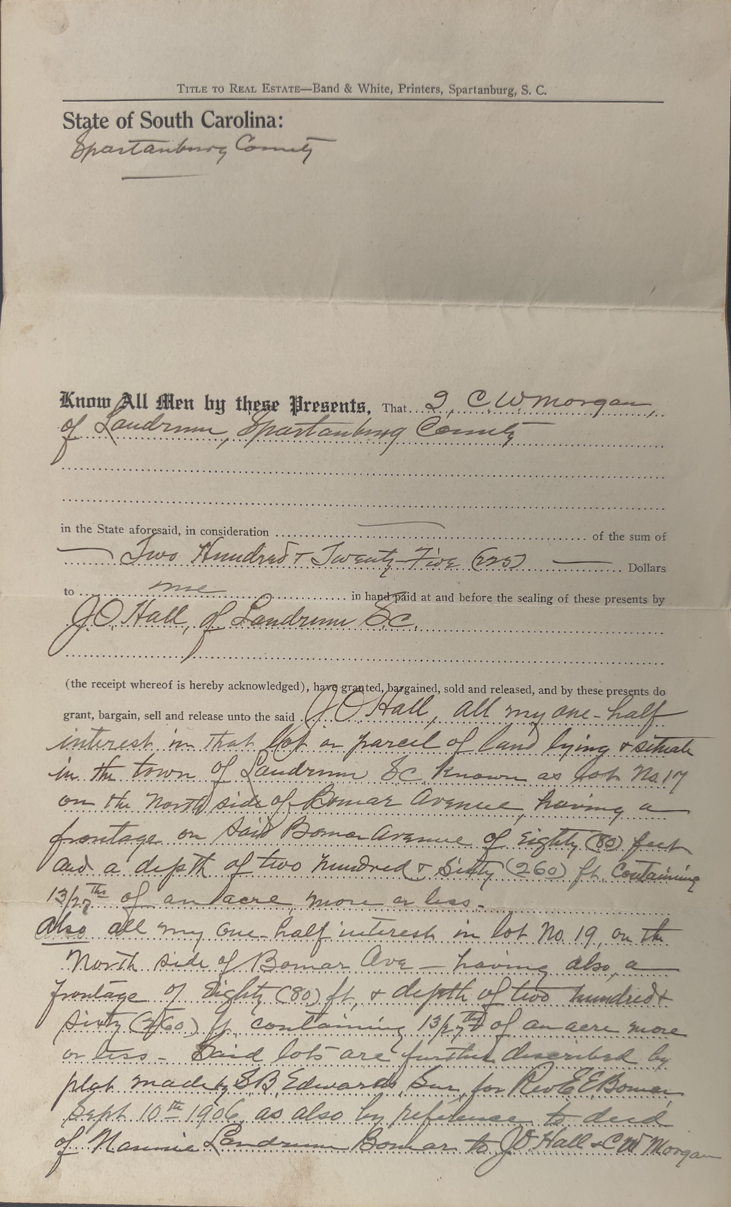 Real Estate title: Nannie Landrum Bomar to JO Hall and CW Morgan