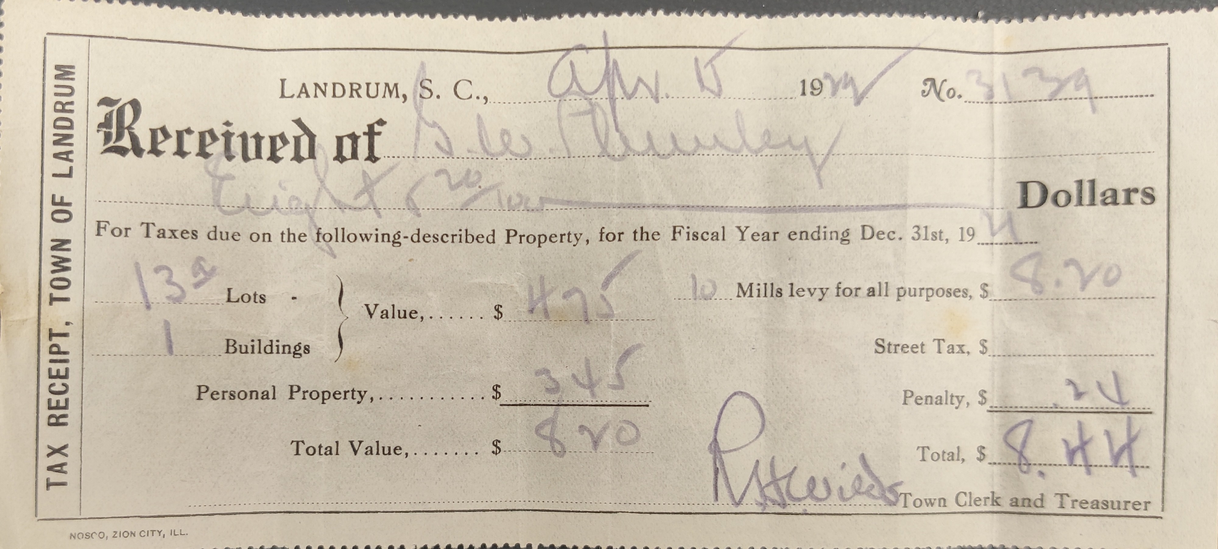 - Landrum, SC tax receipt: received of G. W. Plumley $8.44 of which $8.20 is tax levied on 13a lots with 1 building valued at $475 plus personal property valued at $345 for a total value of $820; plus a penalty of 24 cents.