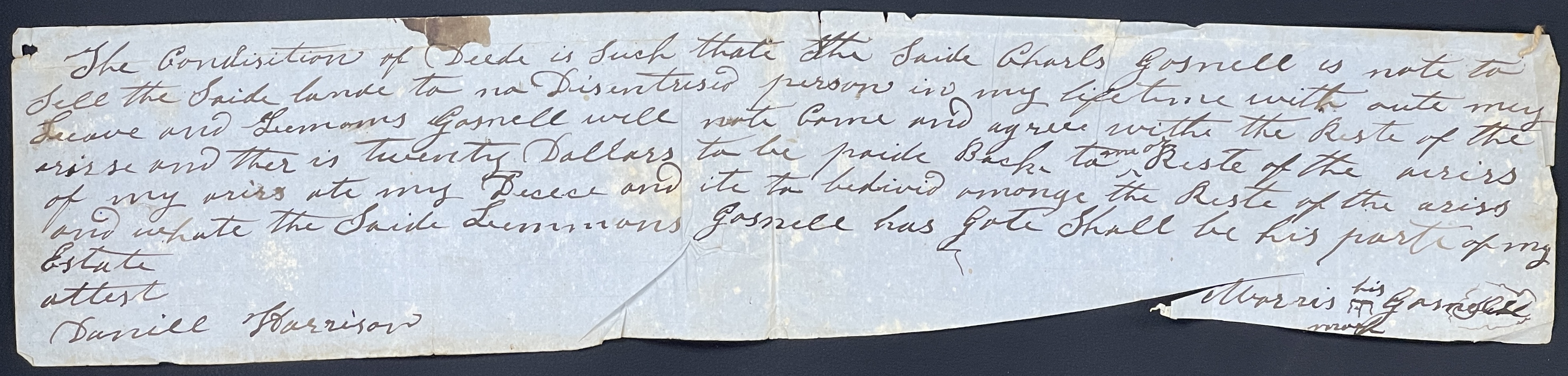 The condisition of Deede is Such thate the Saide Charls Gosnell is note to Sell the Saide lande to no Disentrised person in my liefetime with oute my Leave and Lemons Gosnell will note Come and agree withe the Reste of the arirs and ther is twenty Dollars to be paide Back. to me or Reste of the Airirs of my arirs ate my Decece and ite to bedivid amonge the Reste of the arirs and whate the Said Lemmons Gosnell has Gote Shall be his parte of my Estate