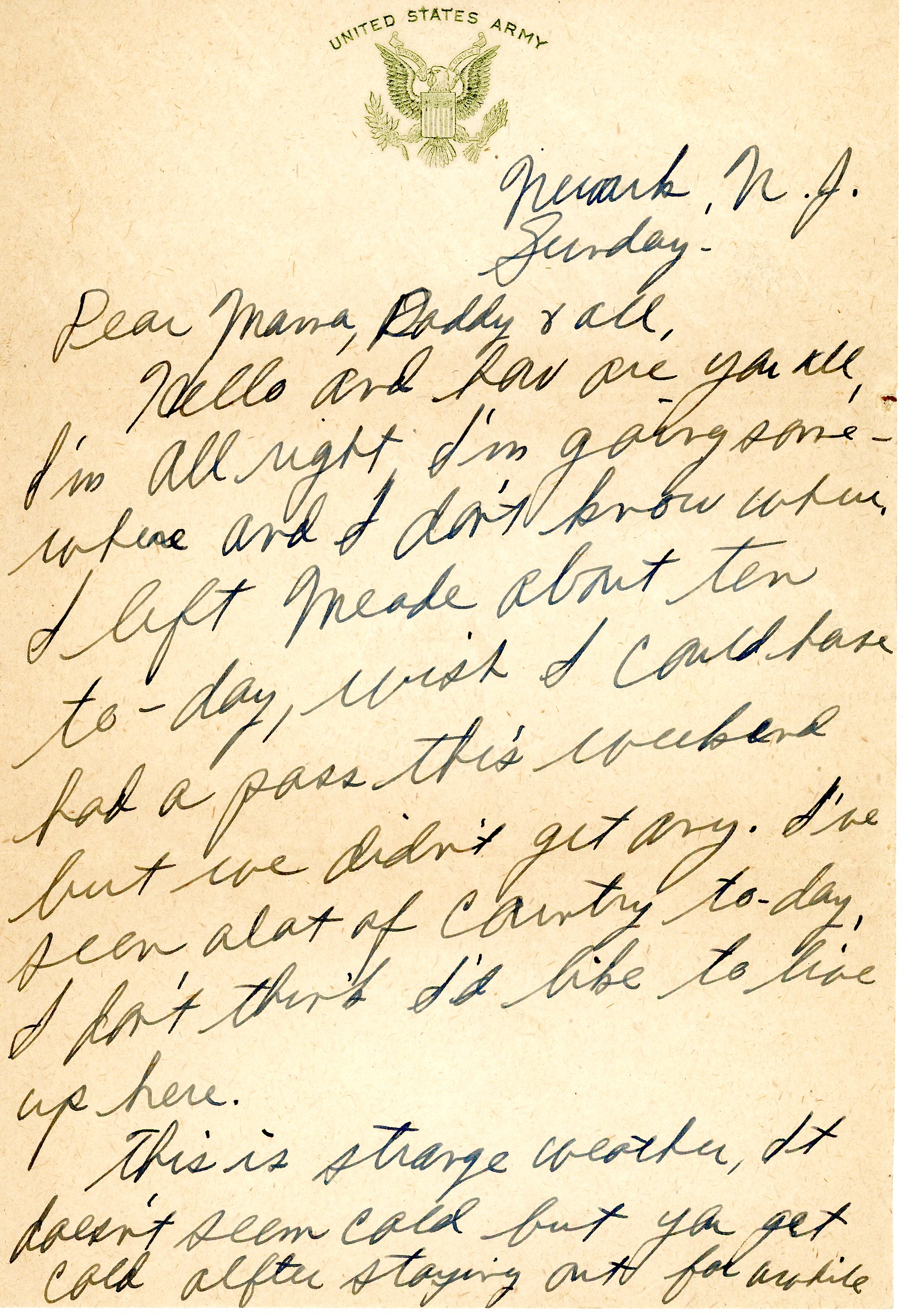 - Letter addressed to "Mama, Daddy +all" from Newark, N.J.