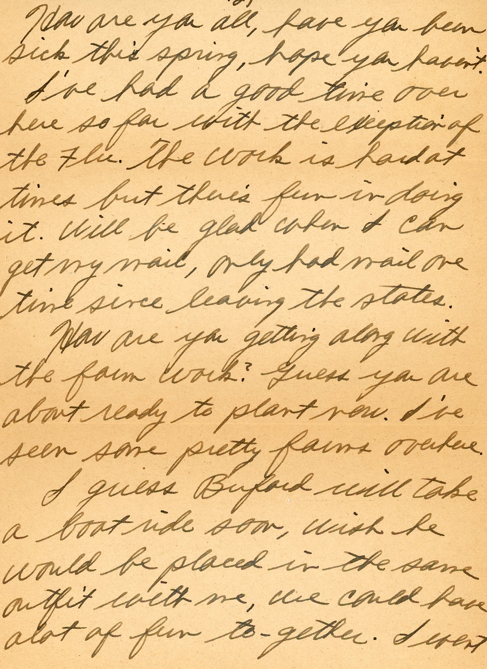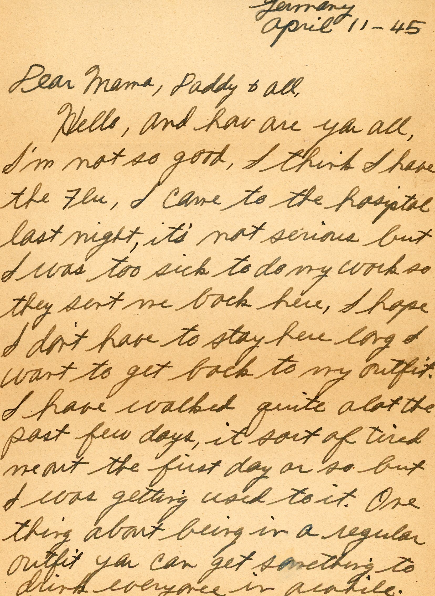 Hello, and how are you all, I'm not so good, I think I have the flu. I came to the hospital last night, it's not serious but I was too sick to do my work so they sent me back here. I hope I don't have to stay here long I want to get back to my outfit. I have walked quite alot the past few days, it wost of tired me out the first day or so but I was getting used to it. One thing about being in a regular outfit you can get something to drink every once in a while. How are you all, have you been sick this spring, hope you haven't. I've had a good time over here so far with the exception of the flu. The work is hard at times but there's fun in doing it. Will be glad when I can get my mail, only had mail one time since leaving the states.