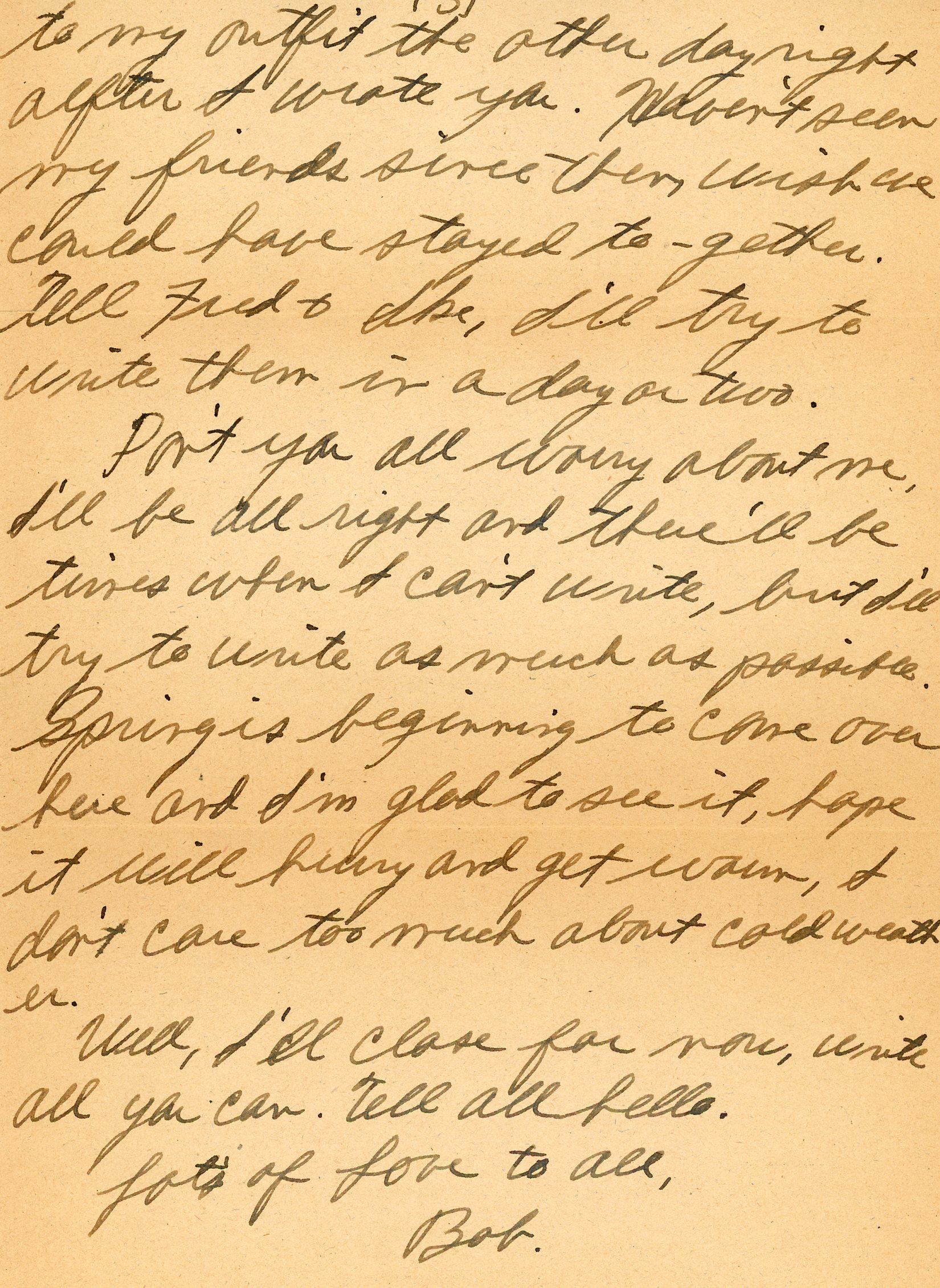 Don't you all worry about me, I'll be all right and there'll be times when I can't write as much as possible. Spring is beginning to come over here and I'm glad to see it, hope it will hurry and get warm, I don't care too much about cold weather.